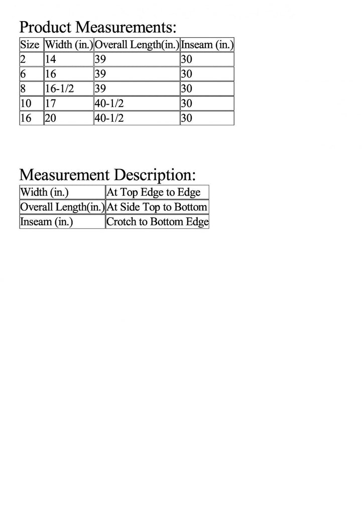 | Size | Width (in.) | Overall Length(in.) | Inseam (in.) |