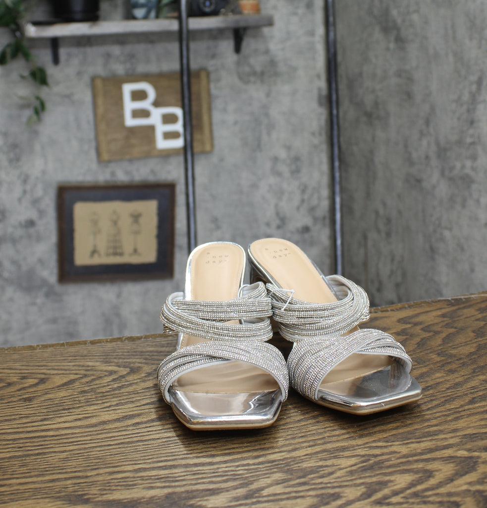Add some silver bling to your going-out looks with these Tammy Rhinestone Heels from A New Day. These block-heel sandals feature an airy open-toe design that's enhance by dual rhinestone-embellished crossover straps for a touch of shine. The sandals have cushioned insoles for comfortable walking, and the slip-on style provides easy on and off.A New Day: Style that goes wherever you do. Silver rhinestone heels Open toe with dual crossover straps Cushioned insole 3.25in block heels Textured outsole Slip-on style Sizing: Womens Construction: Cushioned Insole Footwear Insole Material: 100% Polyurethane Features: Slip On Care and Cleaning: Clean With Mild Detergent Footwear Lining Material: 100% Polyester Toe Style: D Toe Footwear Upper Material: 8% Polyester and 92% Glass Beads Heel: Approximately 3.25 Inches Block Heel Footwear Outsole Material: 55% Polyester and 45% TPR (Thermoplastic Rubber) Shoe Width: Medium Footwear toe openness: Open Toe Footwear outsole details: Textured Outsole