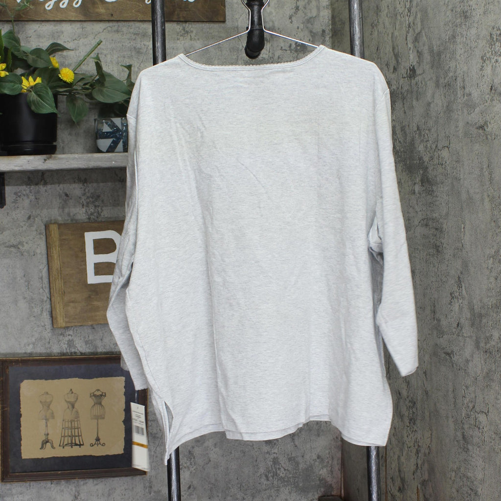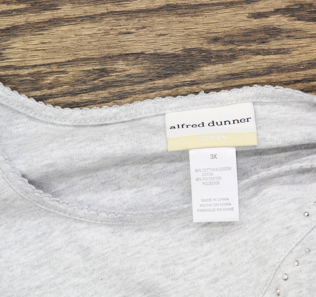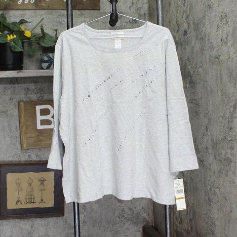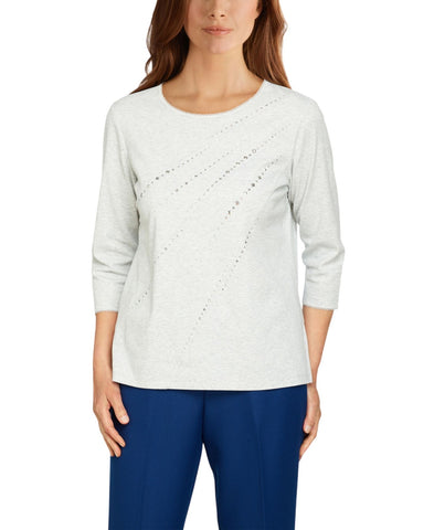 Classics plus size make the season more dazzling with our unique embellished knit women's top. This versatile style is fashioned with picot trim at the crew neckline and three-quarter length sleeves.