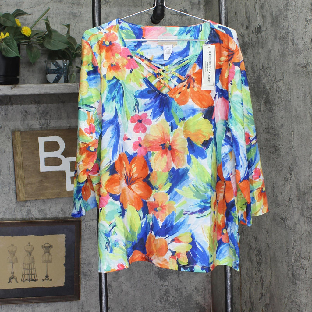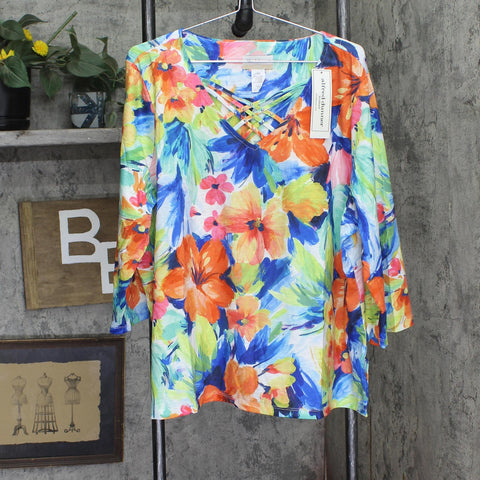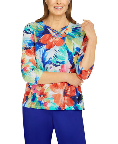 Amalfi coast plus size sail out to the coast wearing our vibrant watercolor floral print women's top. This three-quarter length sleeve style is fashioned with subtle embellishments at the lattice V-neck for a feminine touch.