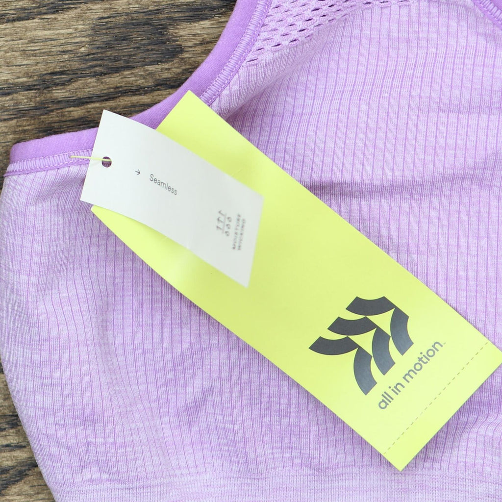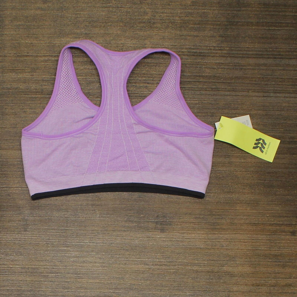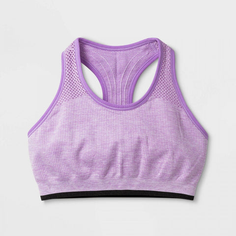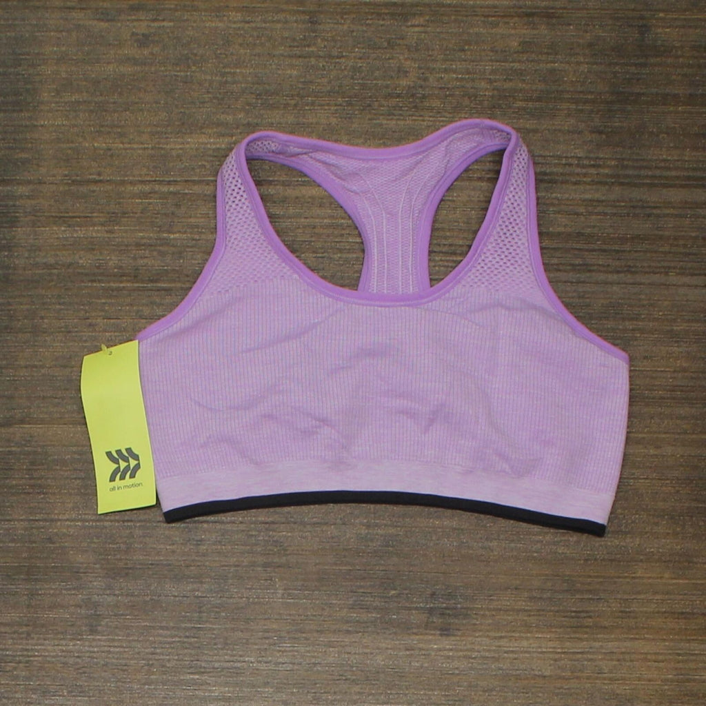 Why were ALL IN: Whether its a leisurely game in gym class or an after-school practice, a simple design lets your girl focus on her sport. Stretchy fabric makes it easy for her not only to move, bend, jump and play with ease, but to dress and undress swiftly. The seamless design lays discretely beneath her clothes so she can go about her activities in confidence, and she wont feel the need to readjust a bulky or cumbersome sports bra. Plus, she'll love the touch of pretty style from the lilac hue and black contrasting band. Whatever her game, this piece is a perfect companion for her active tees and tank tops. When families come together to discover the joy of staying active, All In Motion is there to make it easy and comfortable to embrace a bustling lifestyle.