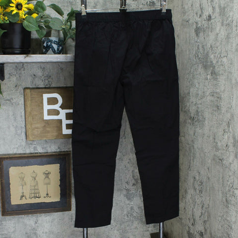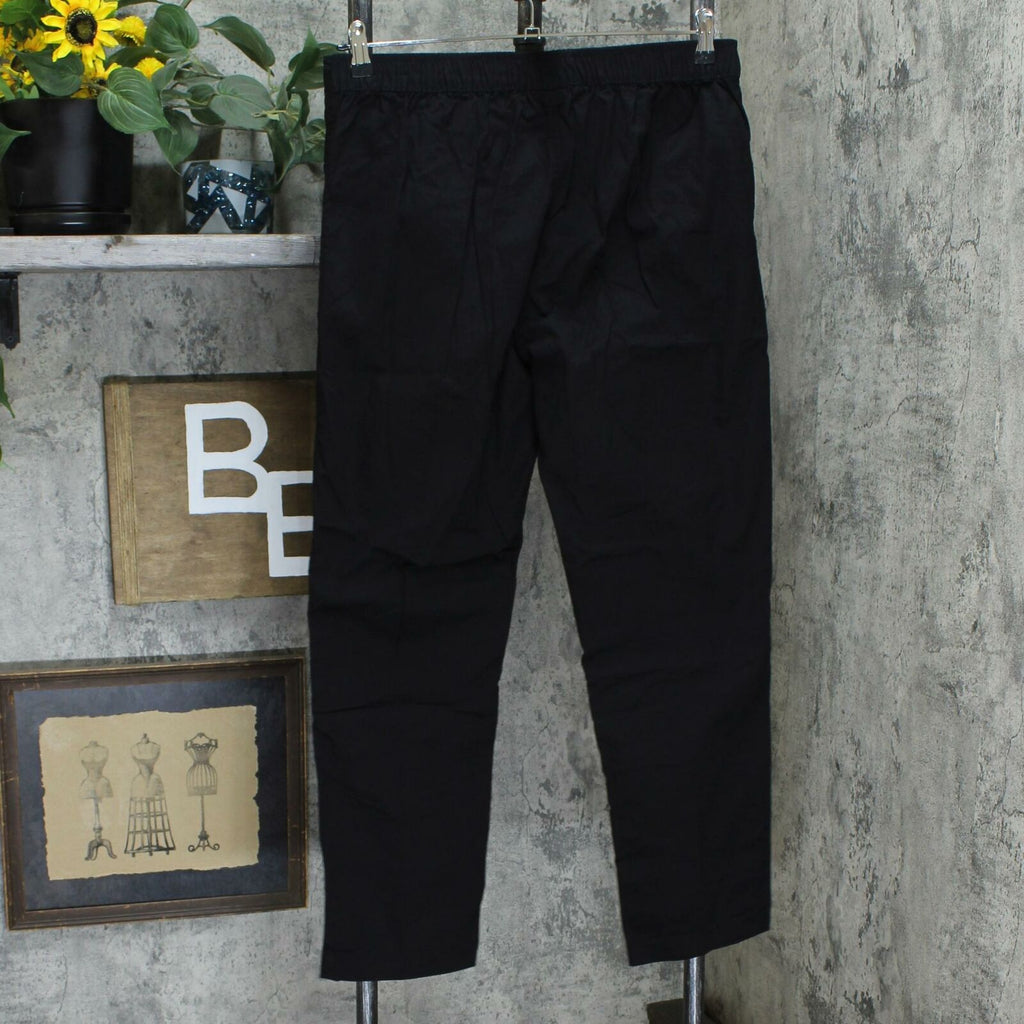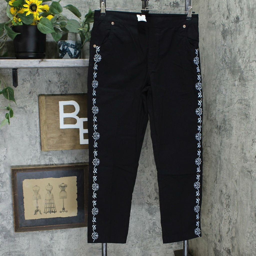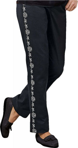 You'll just love the elongating tendrils of embroidery down the sides! And the wink of sparkle courtesy of silver studs! Flat front with mock fly; no-gap back elastic. Plus, side pockets with fashionable rivets. Soft-touch woven cotton is machine wash/dry.