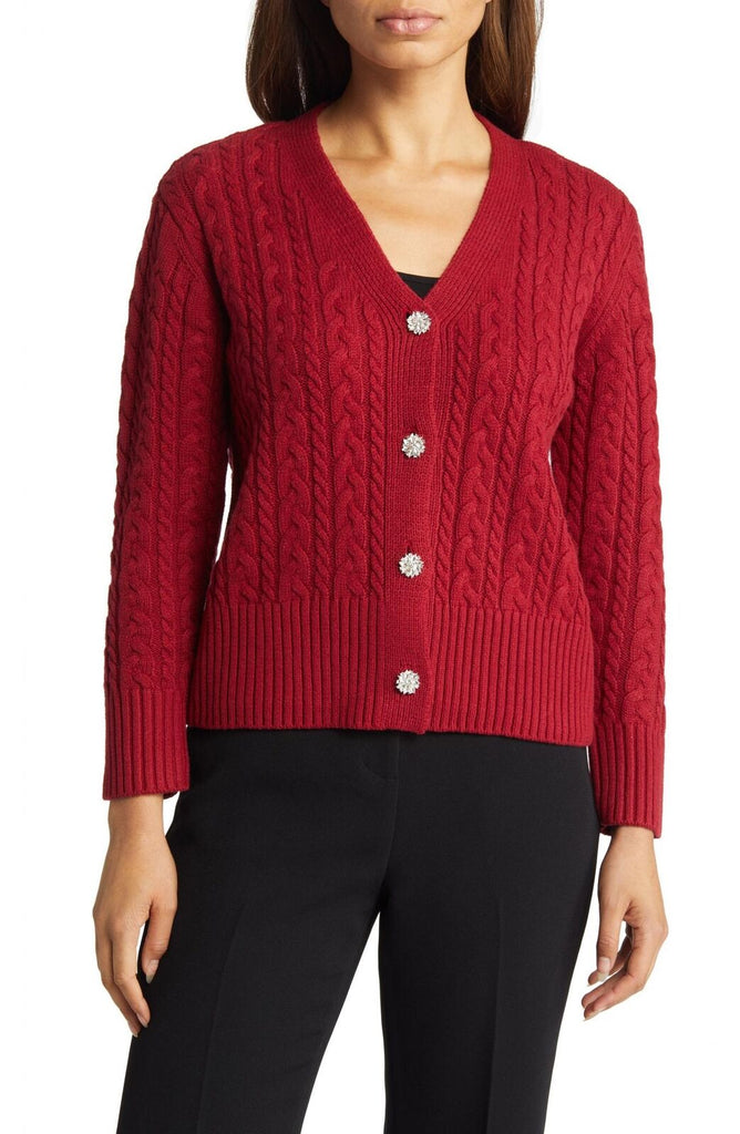 Crystal buttons add an elegant touch to this cable-knit cardigan crafted from a soft cotton blend. V-neck Long sleeves Ribbed cuffs and hem 60% cotton, 40% acrylic Dry clean Imported