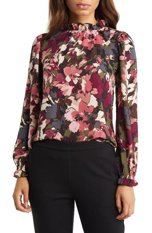 Abstract blooms in rich autumnal hues stand out on a lightweight blouse made with a ruffled neck and cuffs. 25" length Stand collar Long sleeves with elastic cuffs Dry clean Imported