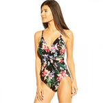 Give your poolside style an instant update with this Wrap One-Piece Swimsuit from Aqua Green. Crafted from a soft and stretchy nylon-spandex blend with a full lining, this floral one-piece swimsuit offers impeccable style and comfortable coverage all at one go. Fashioned with strappy shoulders and cross-back detailing, this black swimsuit comes adorned with a burst of floral prints, adding a pretty pop to your beachwear. This sleek and stylish swimsuit sports a deep V-neckline as well as fabric panels at either side that tie at the front to cinch the waist in and leave you a flattering silhouette.