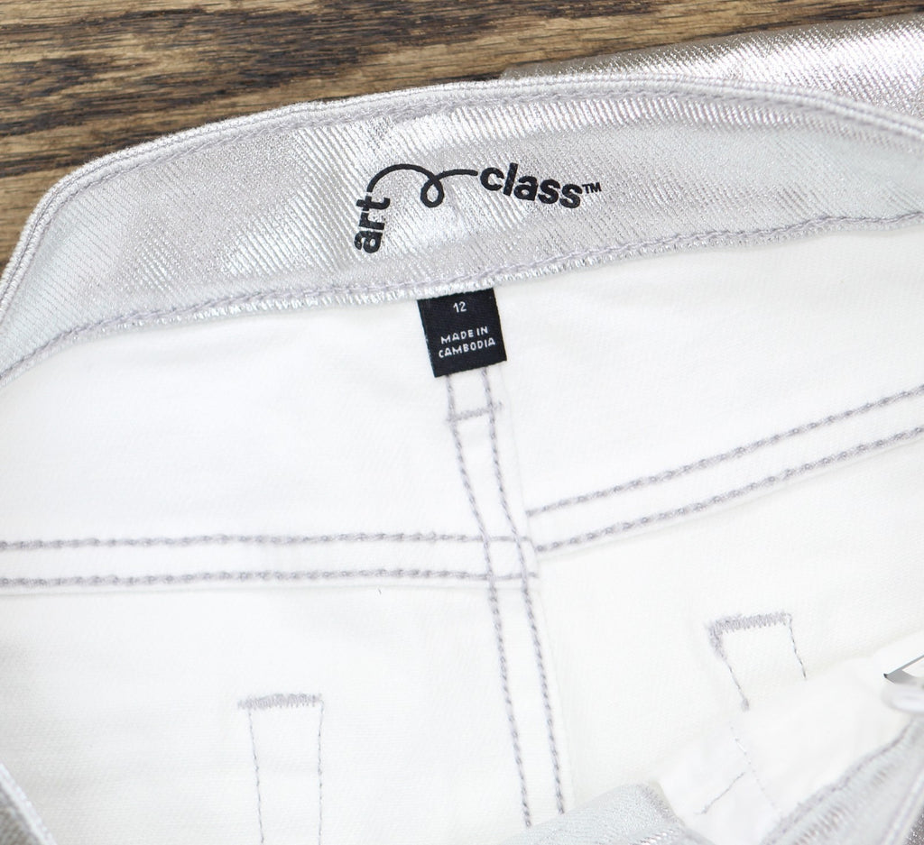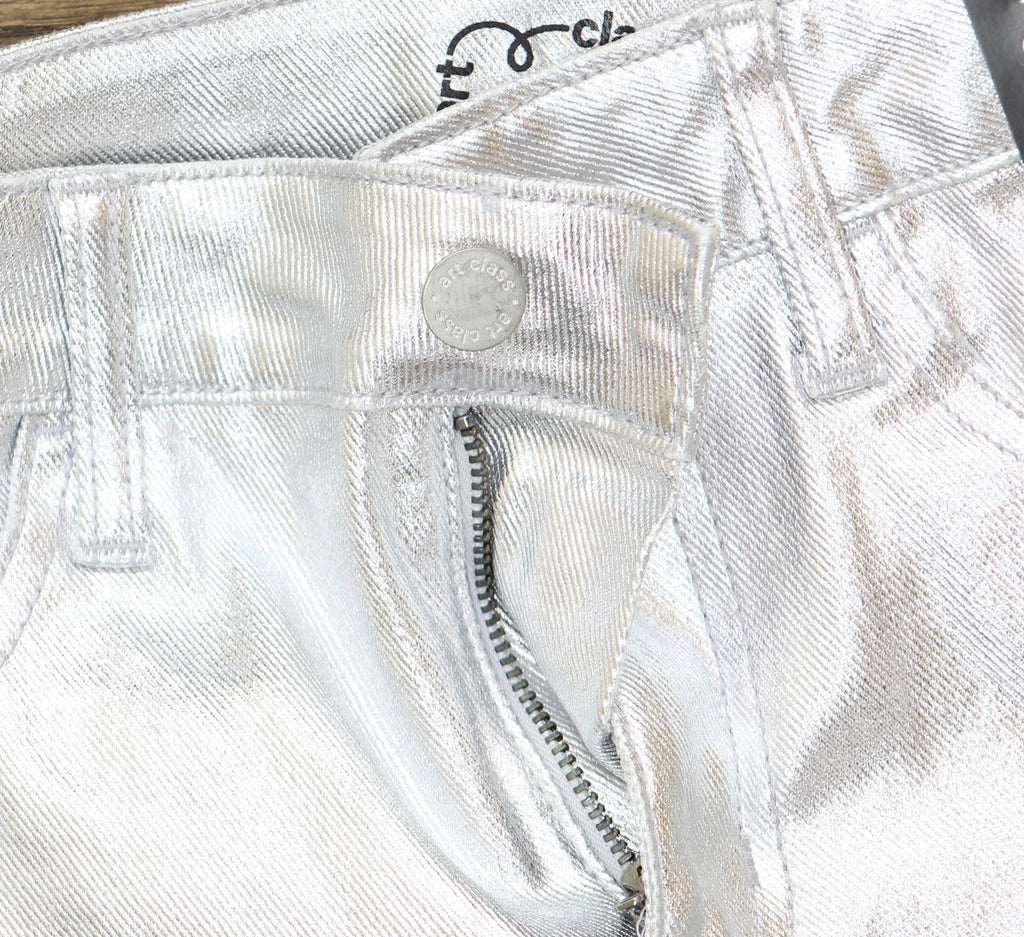 Add some shimmer to your kid's wardrobe with these High-Rise Baggy Metallic Denim Pants from art class. Made of cotton and spandex, these high-rise pants feature a fly button and zipper closure. Tailored in a regular fit, these wide-leg denim pants also have an adjustable waistband for a stay-put fit. Plus, they have two front and back pockets to keep small items handy.art class: One-of-a-kind looks for the one and only you. Stretchable baggy metallic pants Midweight denim fabric Cotton-spandex blend Fly button and zipper closure Adjustable waistband High-rise, wide leg with regular fit Full length Features 4 pockets Sizing: Kids Material: 98% Cotton, 2% Spandex Garment Length: Full Closure Style: Fly Button and Zipper Inseam Length: 27 Inches Rise: High Rise Fit: Wide Leg with a Regular Fit Fabric Name: Denim Garment Details: Adjustable Waistband, Washed Fabric Weight Type: Midweight Fabric Stretch: Stretch Care and Cleaning: Machine Wash, Tumble Dry