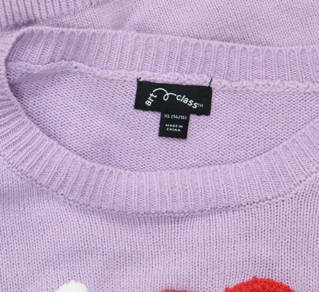 Get your kid ready for sweater season in sweet style with this Long-Sleeve Pullover Sweater from art class. It's fashioned in a light purple shade with two fuzzy white "X" motifs and two red heart motifs, forming a playful XO pattern for a charming look. Crafted for both style and comfort, the crewneck sweater with long sleeves and ribbed edges is made from a lightweight blend of cotton and acrylic for cozy wear. art class: One-of-a-kind looks for the one and only you.