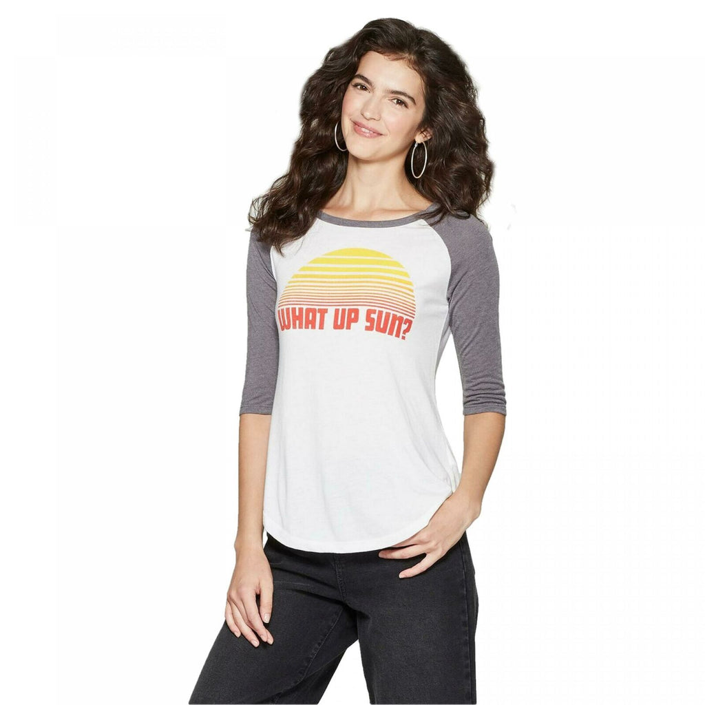 Show off your punny sense of humor with the 3/4 Sleeve What Up Sun Raglan Graphic T-Shirt from Awake. This raglan T-shirt features a white bodice and charcoal sleeves, and is decorated with an '80s-style sun graphic with the words "What Up, Sun?" printed in orange underneath. Add this sun T-shirt to skinny jeans and slide sandals for a trip to your local bookstore, or add to a pleated skirt and low-top sneakers to meet your friends for lunch.