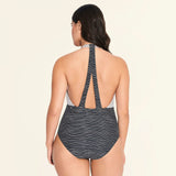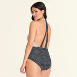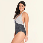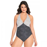 Get some fresh beachside style with the One-Piece Swimsuit from Beach Betty by Miracle Brands. This striped one-piece suit features a halter-style neckline in white, and the contrasting black bottom creates a contoured look you'll love. Foam cups offer shaping and support, while Miracle Brands slimming fabric provides a smooth, flattering finish.
