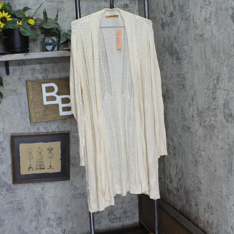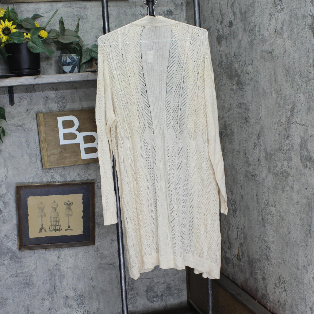 This lightweight cardigan features a delicate pointelle stitch detail. The longer, duster length is on trend, keeping you stylish in any season.