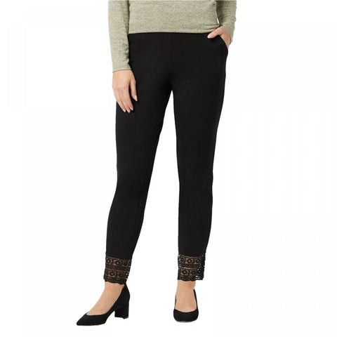 Features: pull-on style, two side-seam pockets, lace trim detail, side vent detail