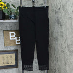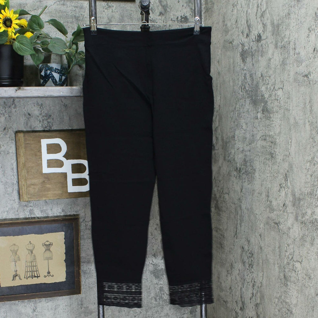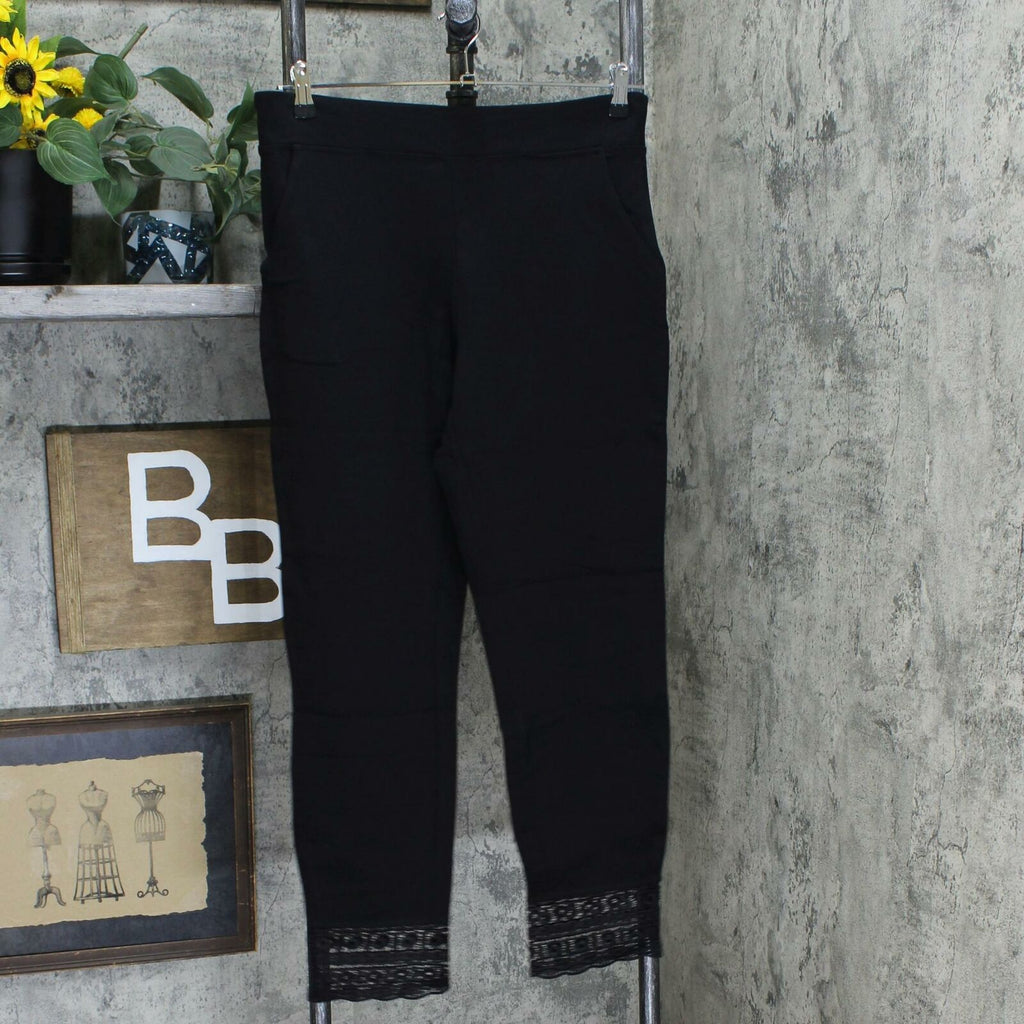 Ponte knit is comfortable; lace embellishment is pretty. Now you know the inspiration behind this pretty, comfortable pair of pants!