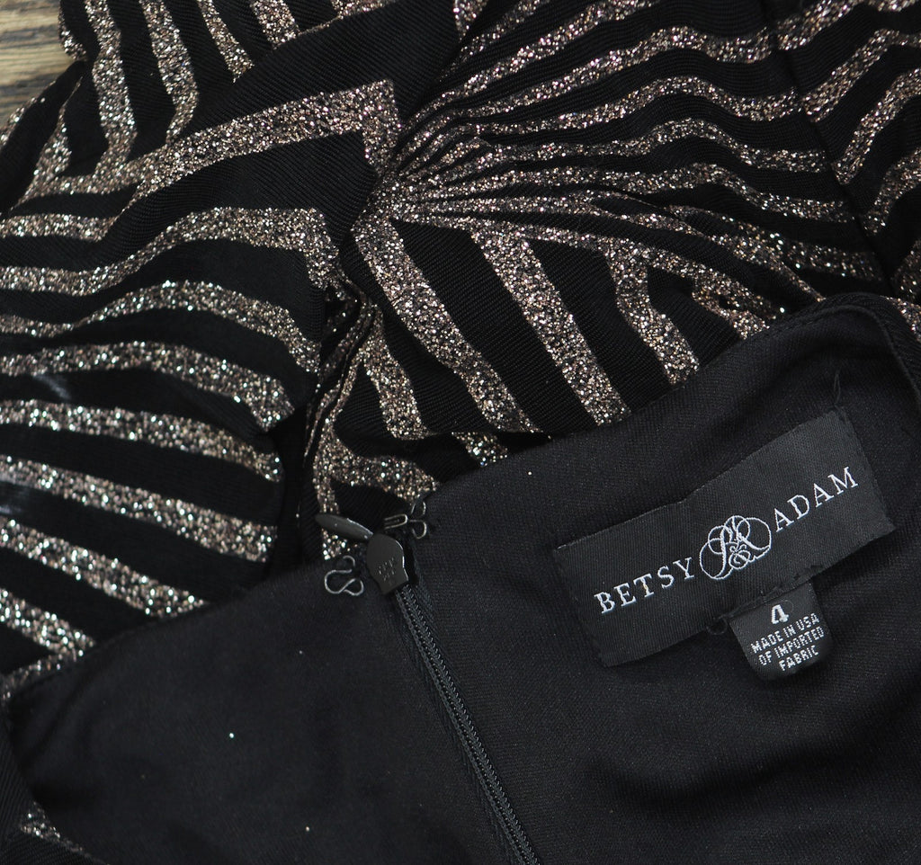 An extravagant print in shimmering glitter covers every inch of this long-sleeve gown from Betsy & Adam. It's the perfect look for your next formal event.