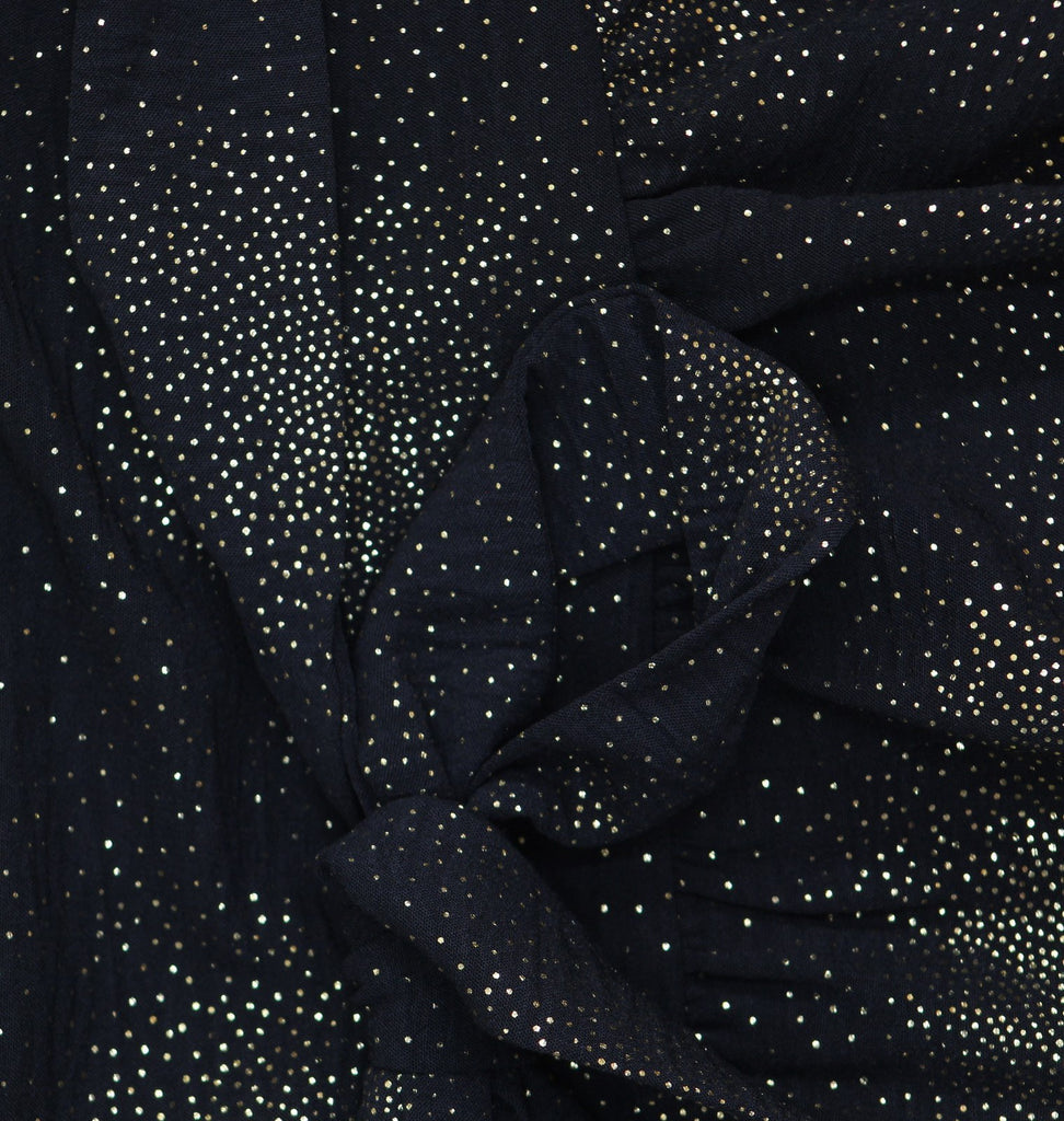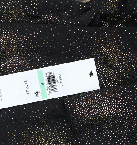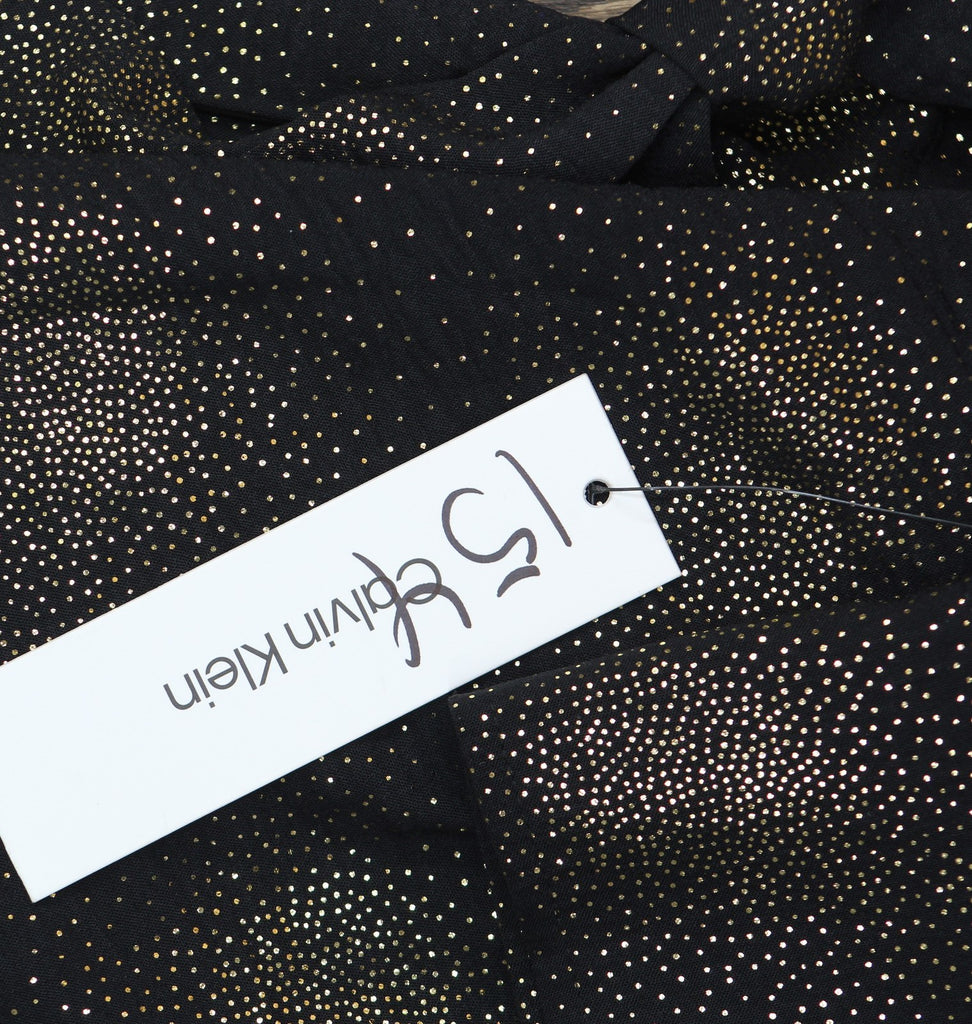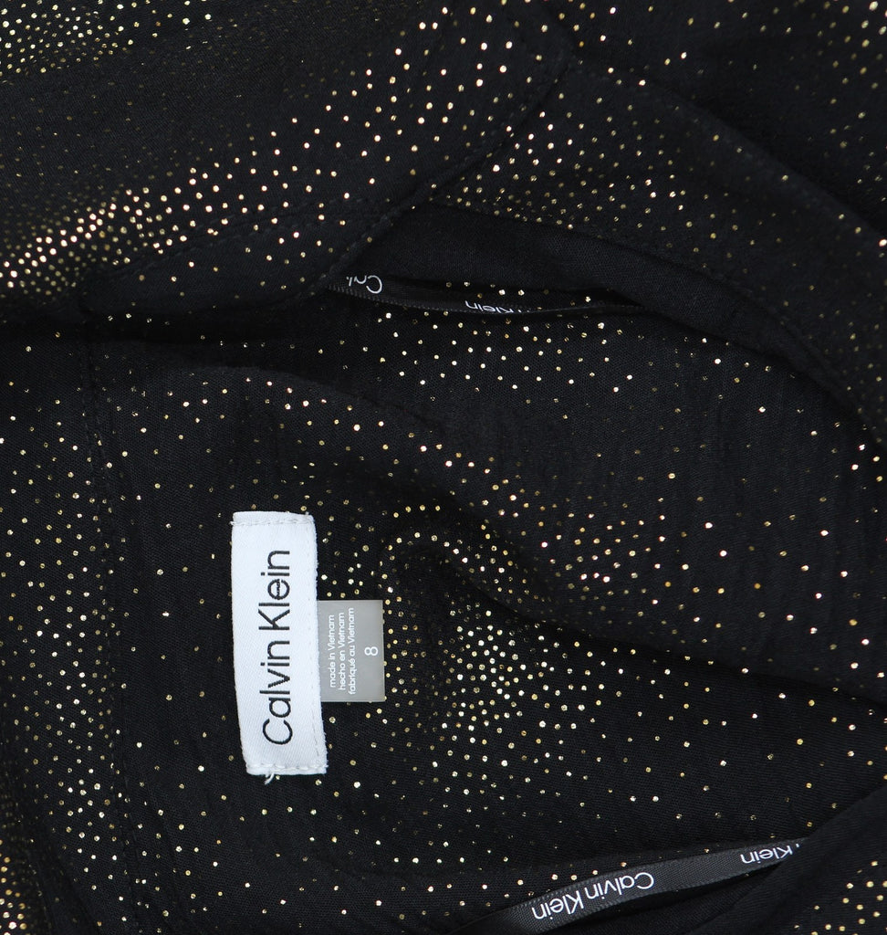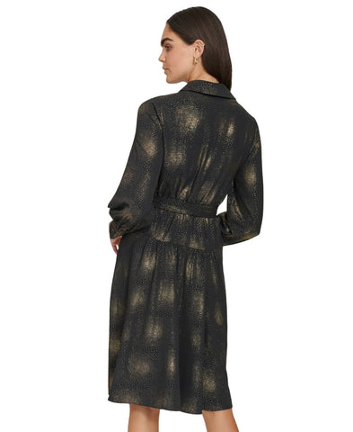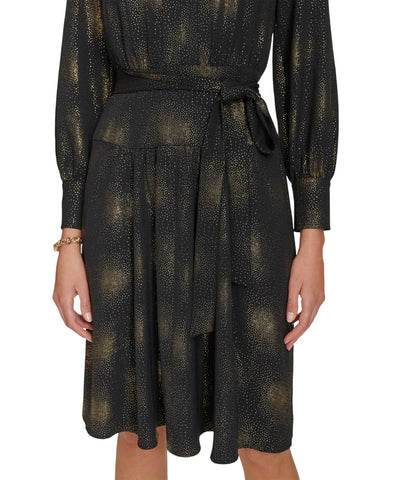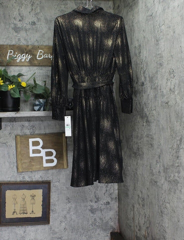This metallic trim MIDI dress from Calvin Klein is designed with a spread collar and long sleeves, the waist tie detail enhances the figure, allowing for a customized fit. Calvin Klein.