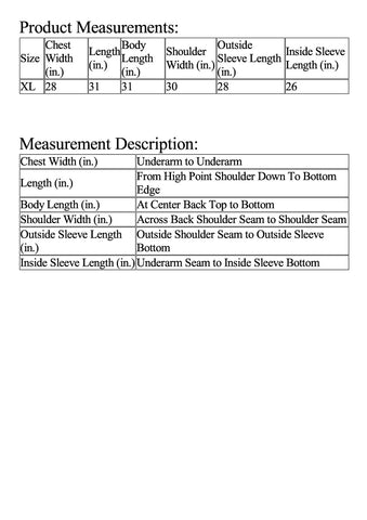 | Size | Chest Width (in.) | Length (in.) | Body Length (in.) | Shoulder Width (in.) | Outside Sleeve Length (in.) | Inside Sleeve Length (in.) |