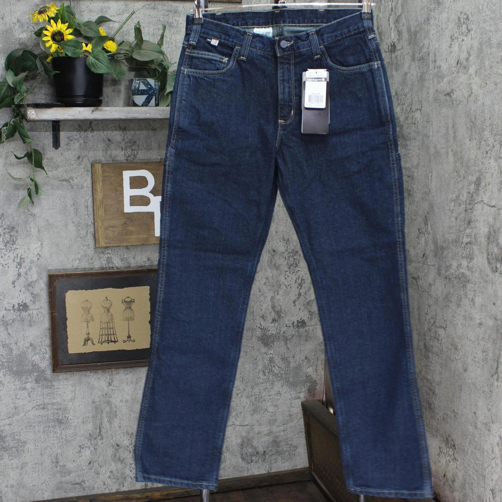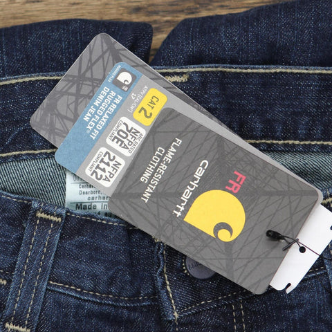 This FR jean stretches and moves with you on the most demanding workdays. 12.5-Ounce, 99 percent cotton/1 percent spandex FR denim • built with rugged flex to bend and stretch with you as you move • relaxed fit sits slightly below the waist • relaxed seat and thigh • garment washed for a soft finish • arc-resistant button closure at waist • brass zipper fly with Nomex FR zipper tape • cell phone pocket on left leg and utility pocket on right leg • two reinforced back pockets • triple-stitched main seams for durability • straight leg opening fits over boots • Carhartt FR label sewn on back pocket; NFPA 2112/cat 2 label sewn on waistband • meets the performance requirements of NFPA 70E and is UL Classified to NFPA 2112
