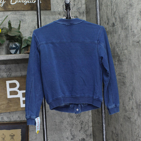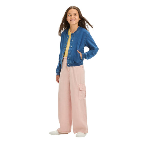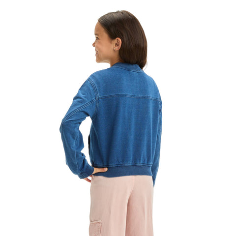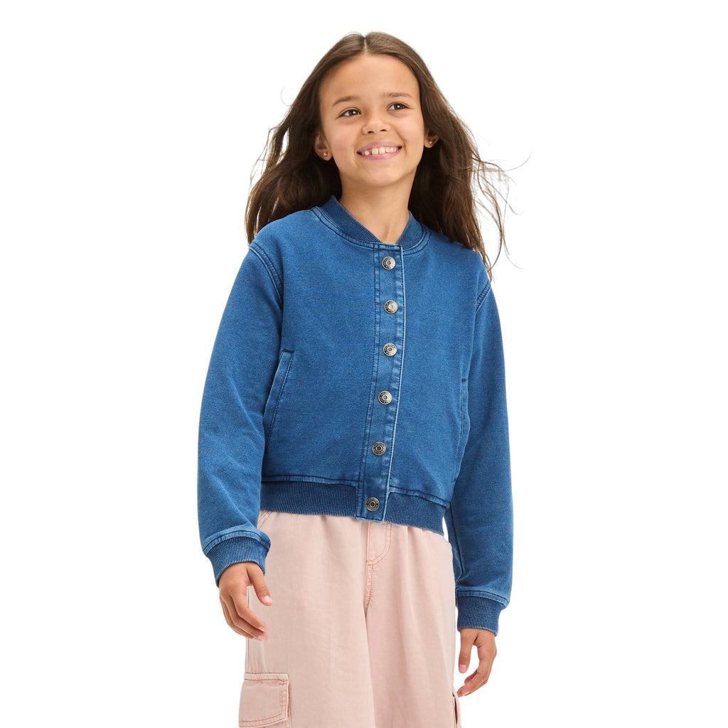 This Varsity Denim Jacket from Cat & Jack adds a fun layering staple to your child's casualwear wardrobe. Made from midweight cotton-blend fabric with spandex, this denim jacket offers them all-day cozy comfort. Designed with ribbed cuffs and a ribbed hem, it features a button-front design for easy on and off and versatile styling. Featuring a medium, enzyme-washed finish for a soft feel plus a stand-up collar, it also has two side pockets and a locker loop for a functional finish.Cat & Jack: Designed for all children so you can trust it's made for yours. Medium-wash varsity denim jacket Midweight fabric with stretch Button-front style Stand-up collar 2 side pockets Recycled polyester Sizing: Girls Material: 72% Cotton, 22% Recycled Polyester, 6% Spandex Fit: Regular Fit Cuff Type: Ribbed Cuff Length: Below Waist Garment Style: Front Snap Fabric Name: Knit Neckline: Stand Up Collar Garment Details: Locker Loop, Back Yoke, Side Pocket, Enzyme Wash Fabric Weight Type: Midweight Fabric Number of Pockets: 2 UPF rating: No UPF Rating Care and Cleaning: Machine Wash, Tumble Dry