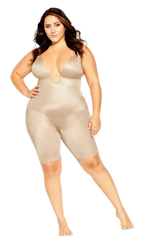 Flattering Plunge Design: The Smooth & Chic Plunge Bodyshaper features a daring neckline that perfectly complements plunging dresses and tops, making it your go-to shapewear for special occasions. Sleek, Firm Support: Enjoy firm tummy and thigh control with strategically placed paneling that smooths and sculpts for a seamless silhouette under any outfit. Customizable Fit: Adjustable, removable, and interchangeable bra straps ensure the perfect fit every time, allowing you to tailor your look to suit any outfit or preference. All-Day Comfort: Crafted with mesh side panels for breathability and a cotton-lined, easy-access crotch panel, this bodyshaper combines both comfort and functionality effortlessly. Cut for Curves: City Chic is redefining fit. We don’t just extend our size range, City Chic designs exclusively for curve bodies.