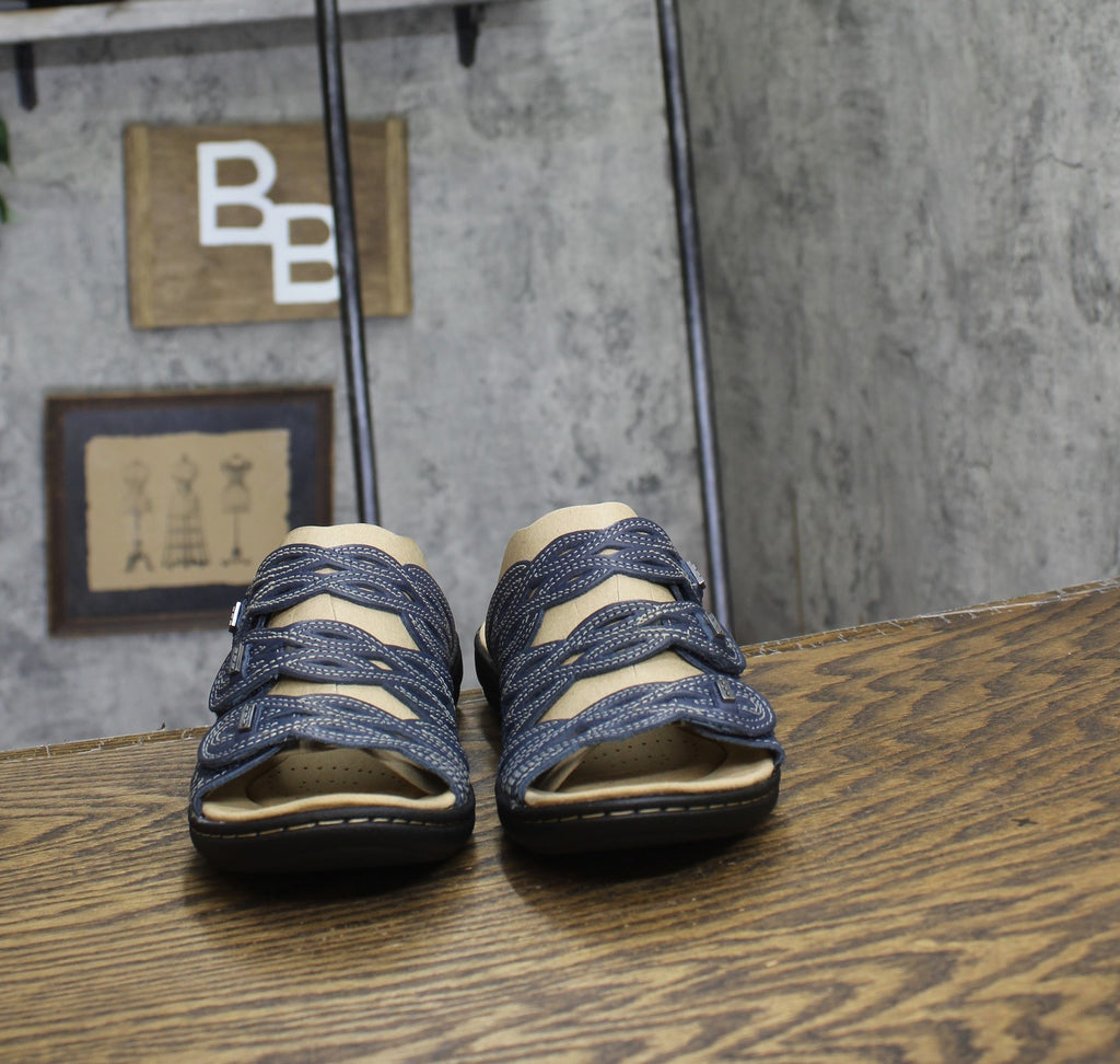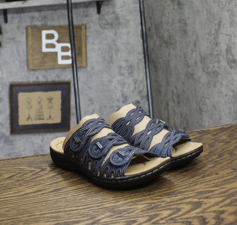 A beach-to-bar sandal that spotlights comfort, Laurieann Ruby is prepped for a memorable summer Premium navy leather upper Ultimate Comfort PU foam footbed delivers lasting cushioning Adjustable upper ensures a secure, custom fit Super-lightweight EVA outsole crafted for enhanced flexibility and optimum traction Heel height: 35mm