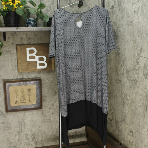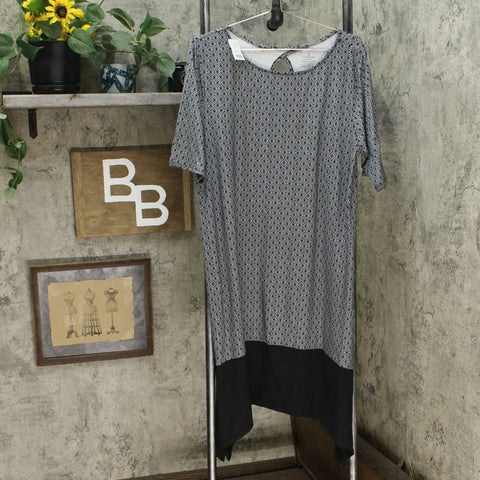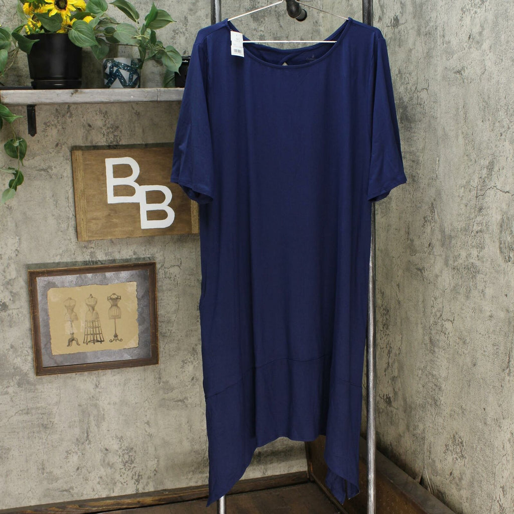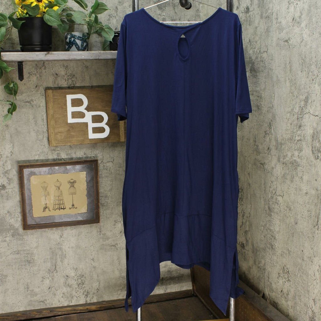 Features: elbow sleeves, rounded neckline, handkerchief hem with side slits, keyhole back detail, pockets