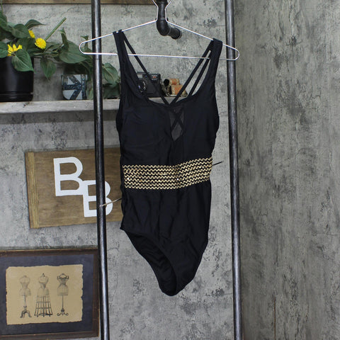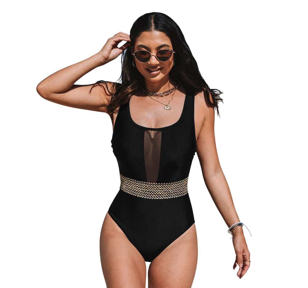 Step into the water with confidence and style in this gorgeous Women's Cupshe Shimmer Waist Tummy Control Mesh Plunge One-Piece Swimsuit. FEATURES: Scoopneck with mesh plunge detail, Sleeveless, Wireless, Removable cups, Tummy slimming design, Ruched detailing, Shimmery front waist belt detail, Lined gusset. FIT & SIZING: Adjustable cross-back straps. FABRIC & CARE: Nylon, spandex, Lining: polyester, spandex, Hand wash, Imported.