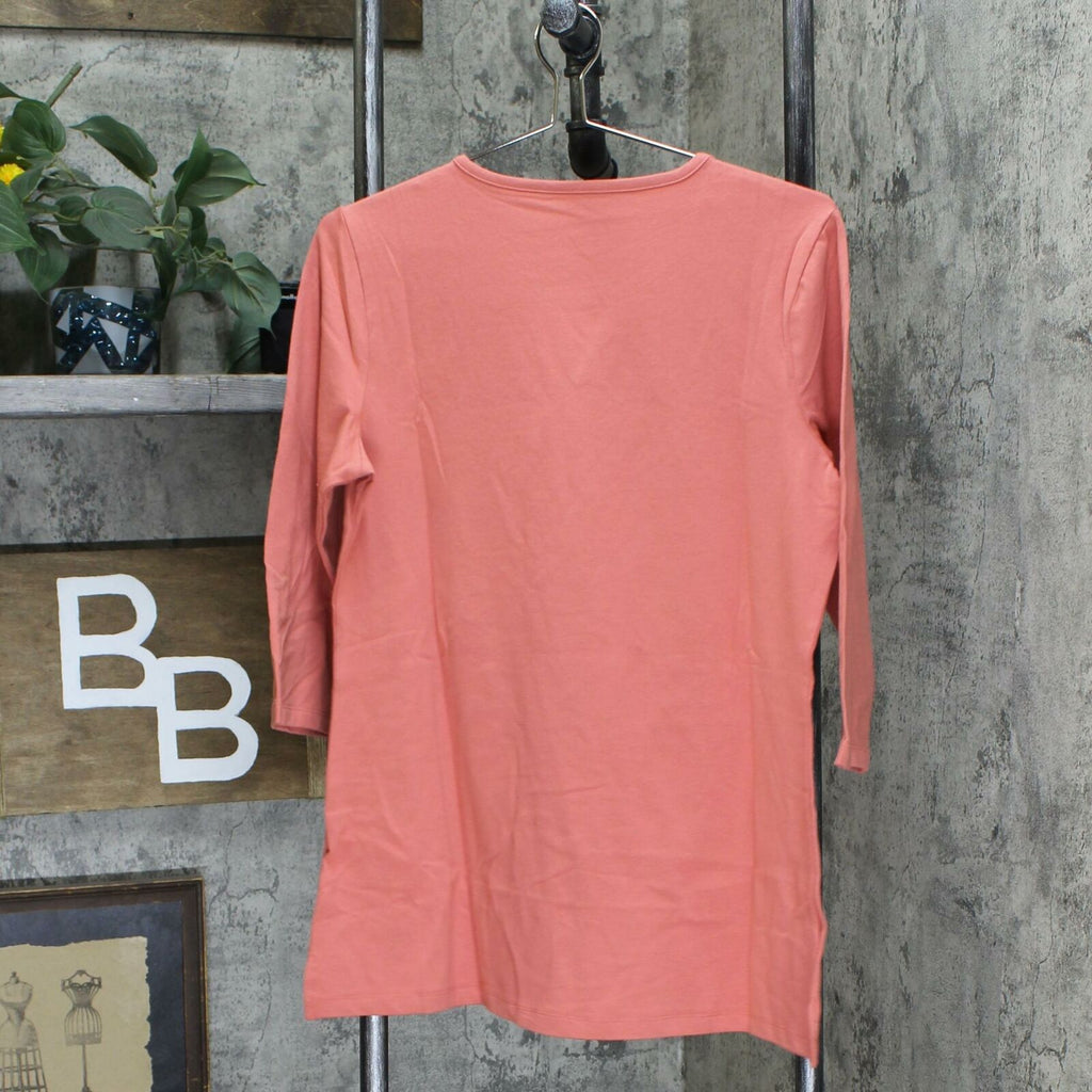 Features: round neckline with keyhole embroidery, 3/4-length sleeves, straight hem with side slits