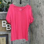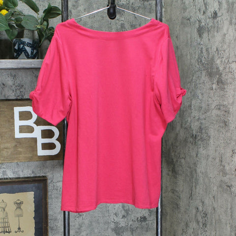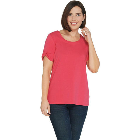 Features: scoop neckline, short sleeves with knot detail on cuff, straight hem