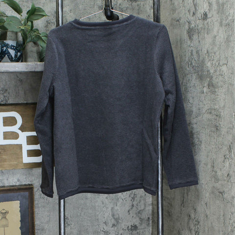 Crew neckline; ribbed around neckline, cuffs, and bottom hem