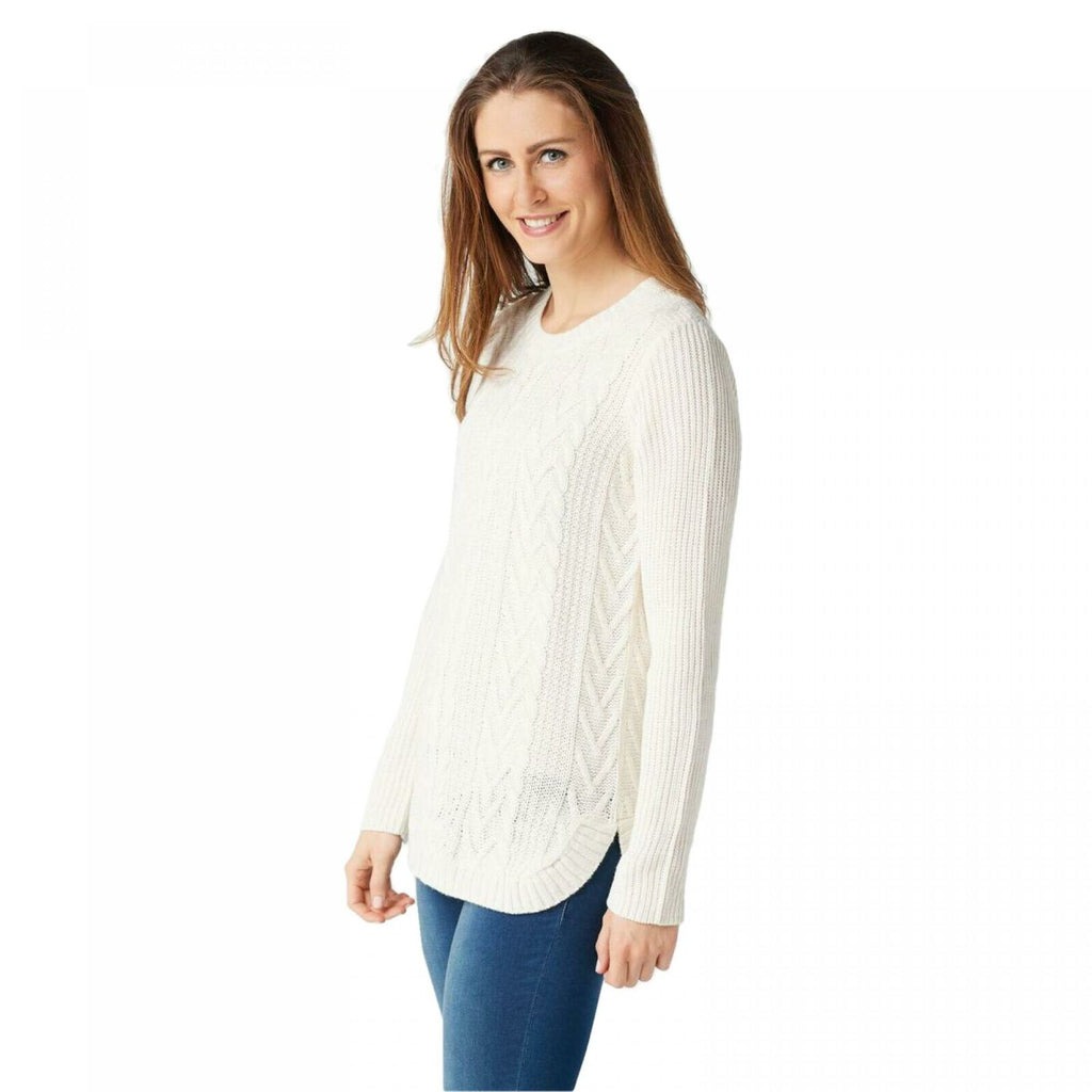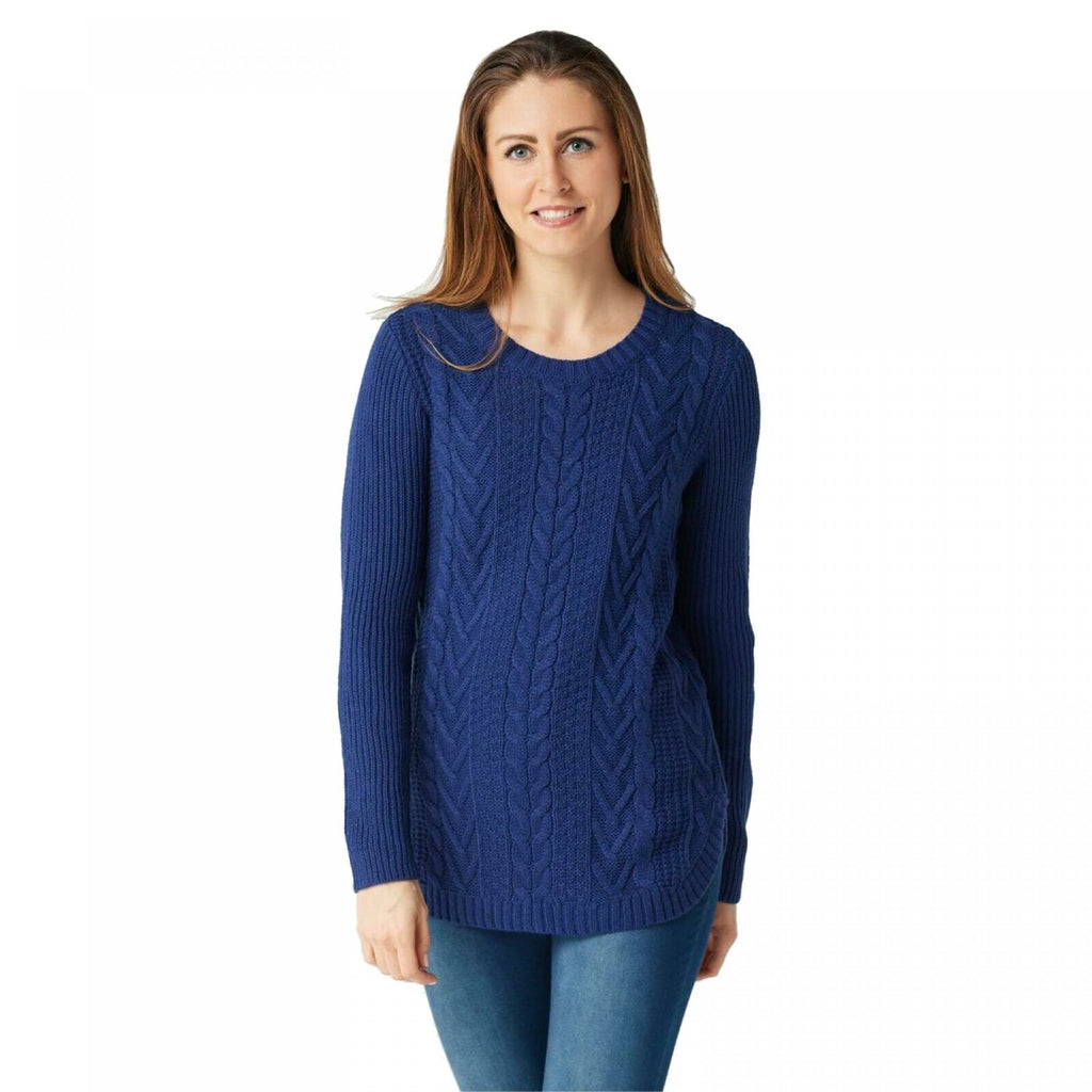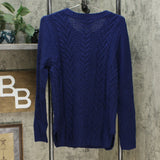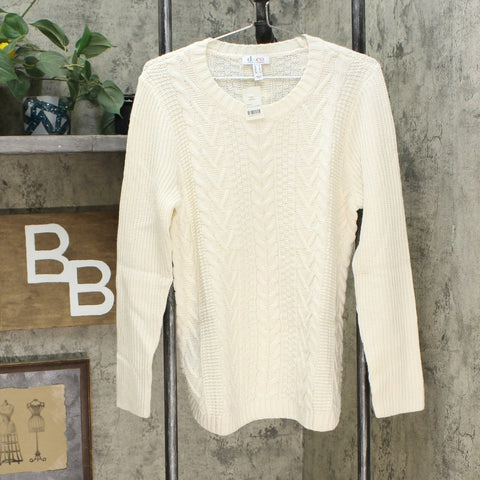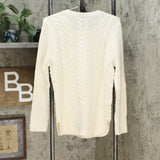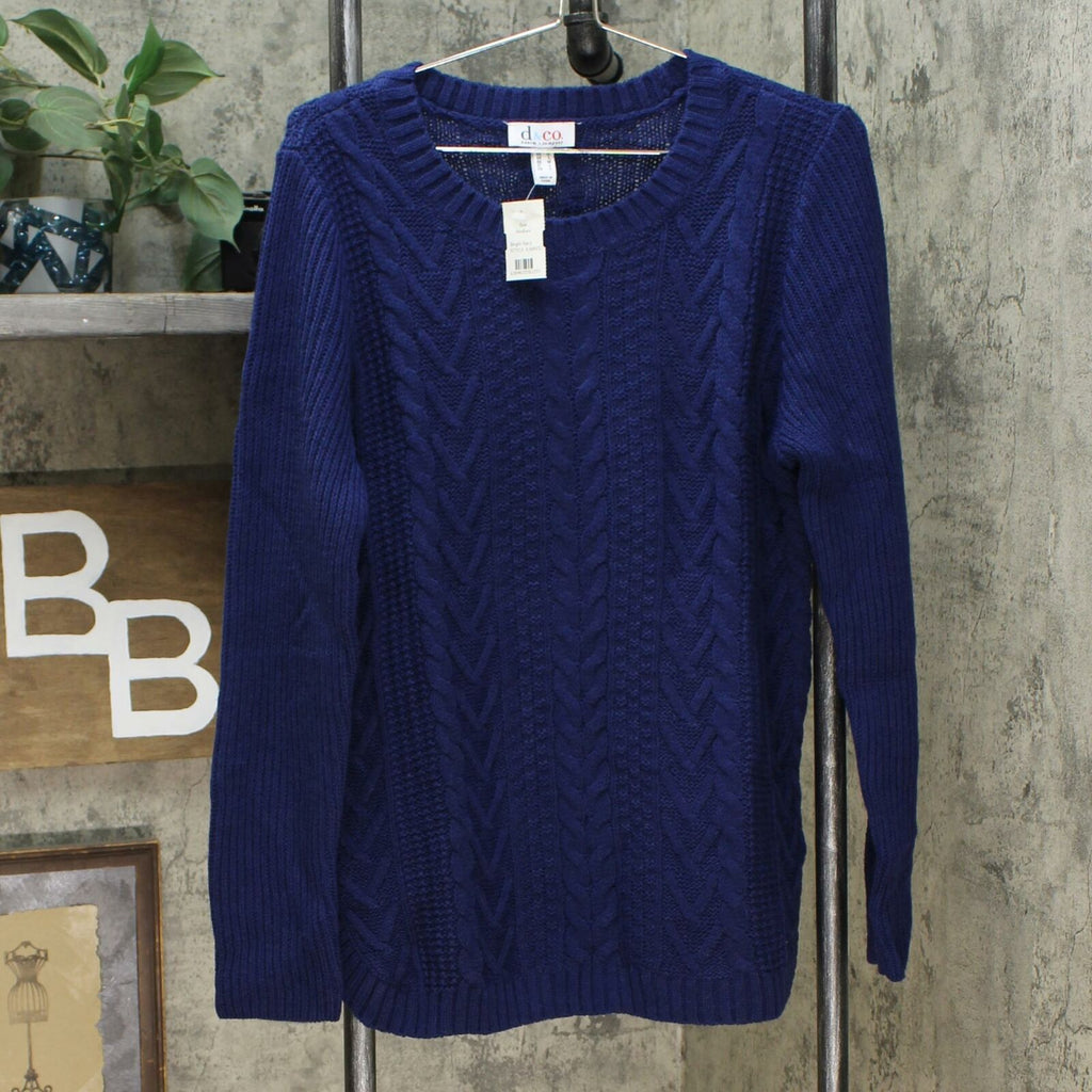 Features: cable stitch on front and back of body, rib-stitched long sleeves, crew neckline, rounded bottom hem