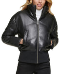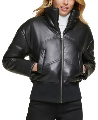 A standup collar and ribbed hem lend fashion-forward edge to this DKNY Jeans puffer jacket, shaped for a snug fit