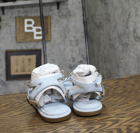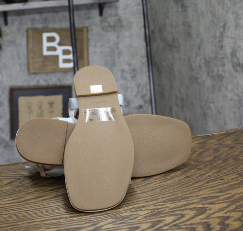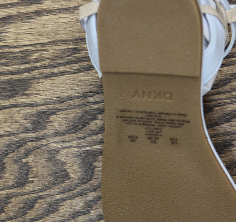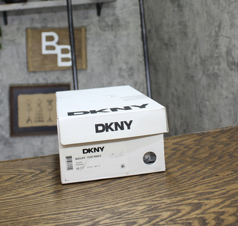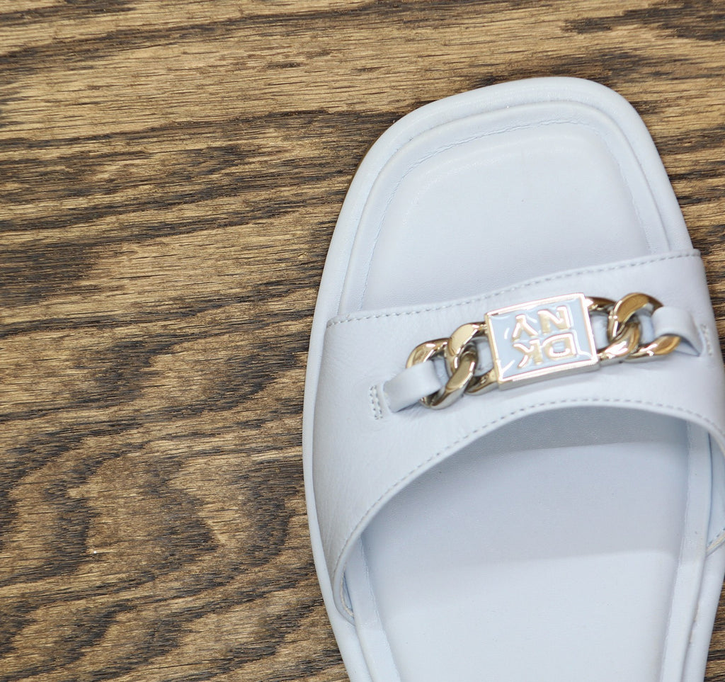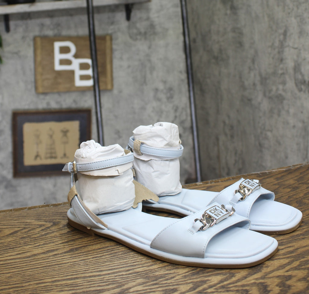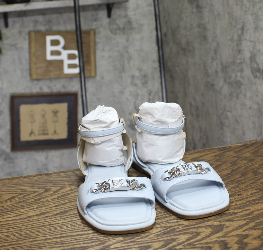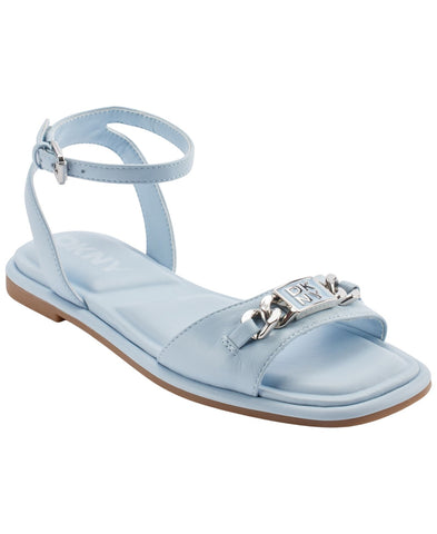DKNY women's Bacliff ankle strap sandal with chain logo detail elevates your everyday summer look. Features Heel height: 0.2" Heel type: Flat heel Square toe Adjustable buckle closure Upper: 85% leather, 15% metal; Lining and Sole: 100% rubber Spot clean Imported