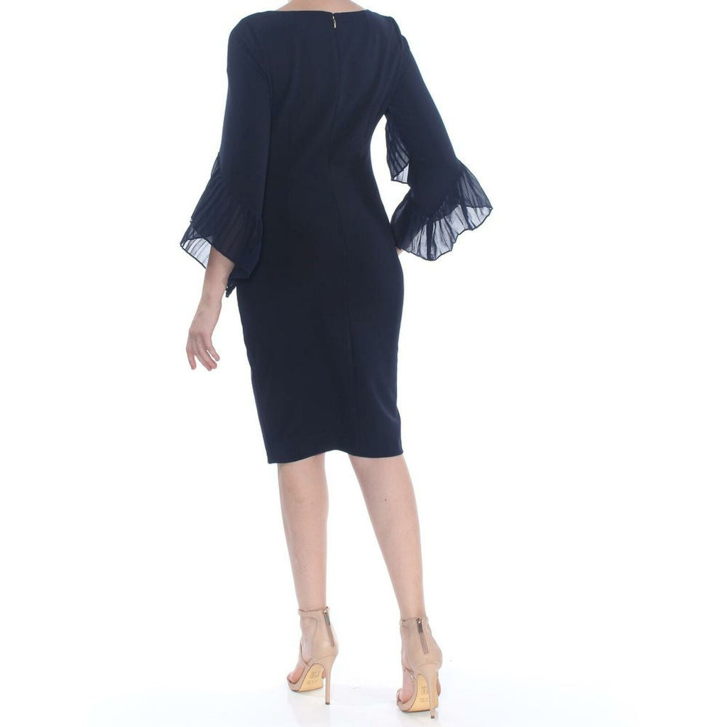 Streamlined by a soft bell sleeve, DKNY's pleated sheath dress easily goes from desk to drinks.