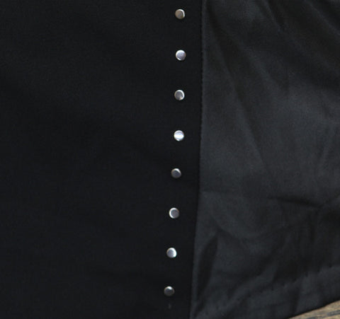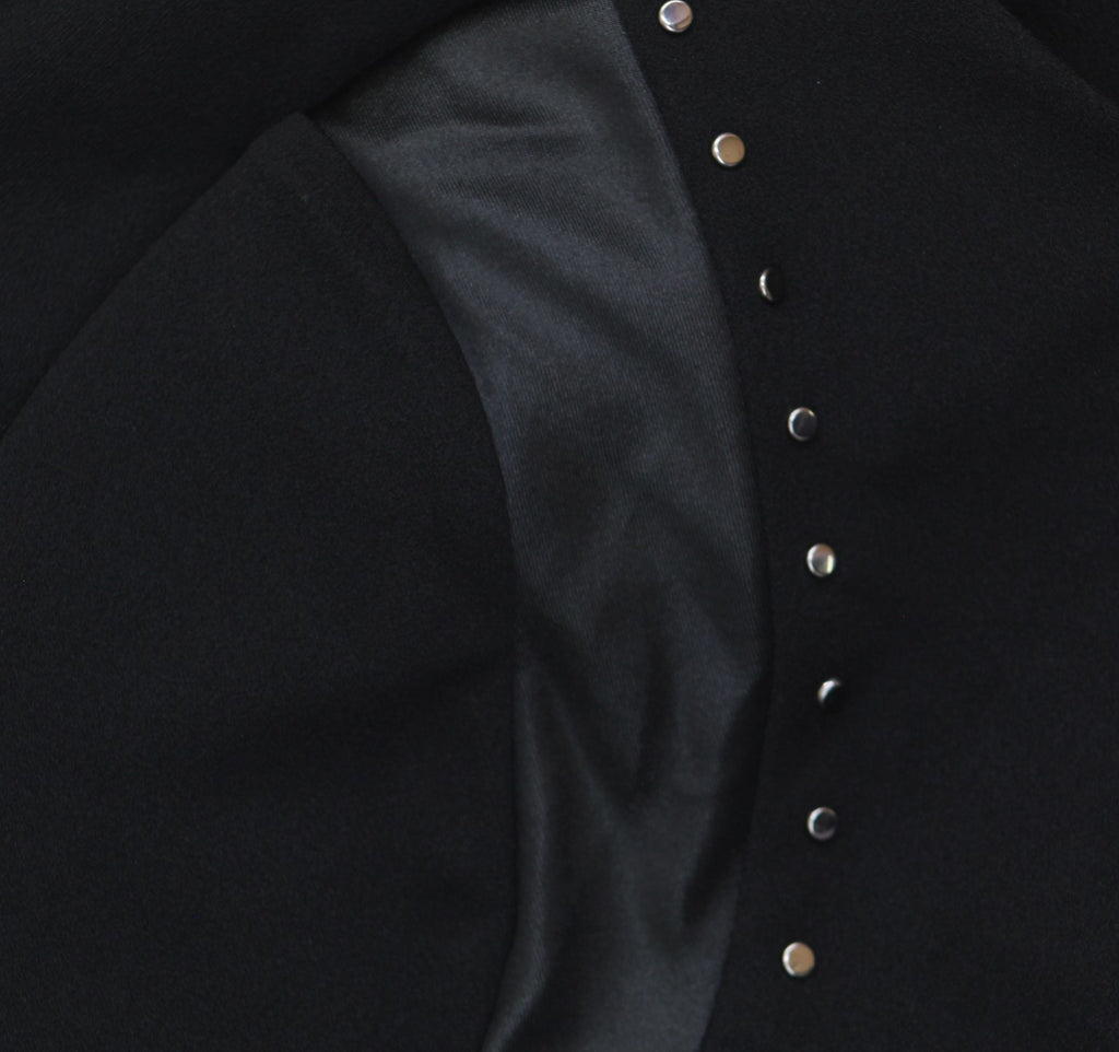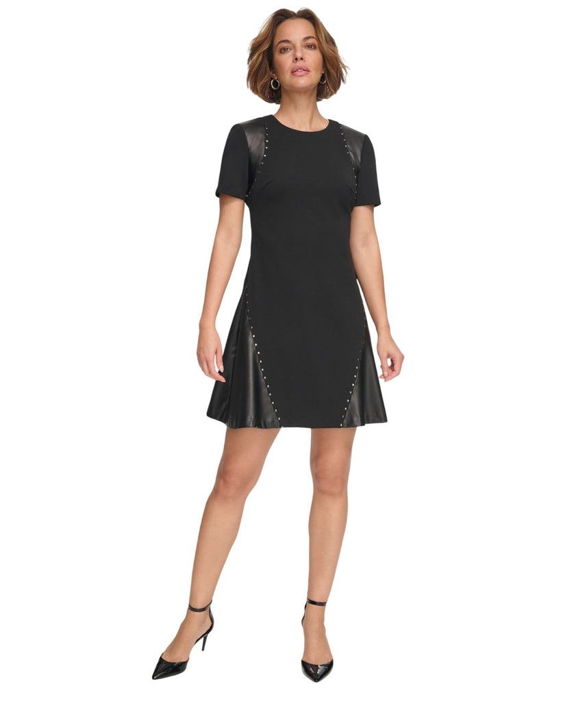 Doubling the edgy appeal with faux-leather panels and studded flash, DKNY's scuba crepe fit & flare dress makes a modern statement. model height is 5'10" and she is wearing a size 6 Approx. 35" long from center back neck to hem.
