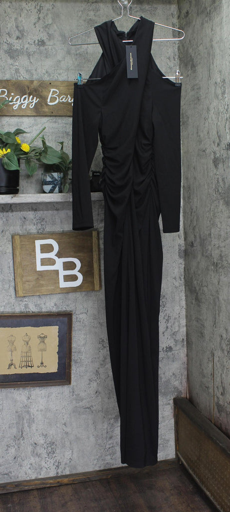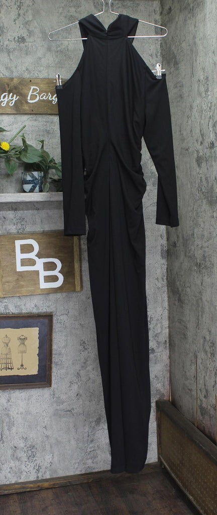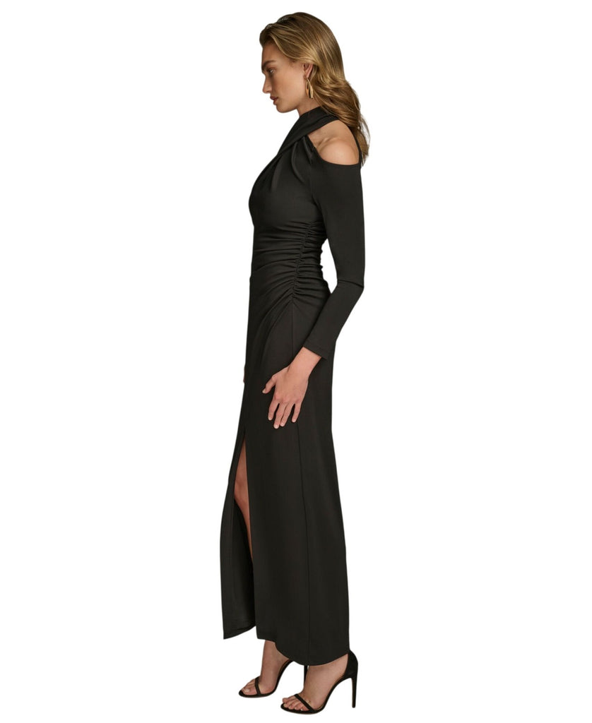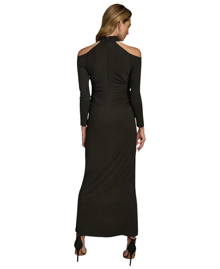 Halter neckline Cold shoulder detail Ruching at front Full length silhouette Zipper closure at back Long sleeve Filament Jersey fabrication Origins: Imported Style: KA4B15K4