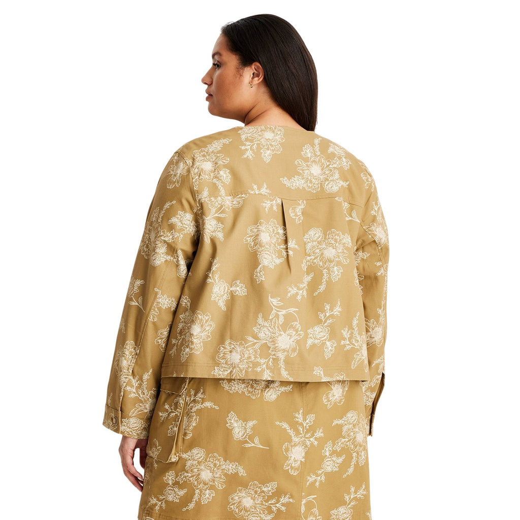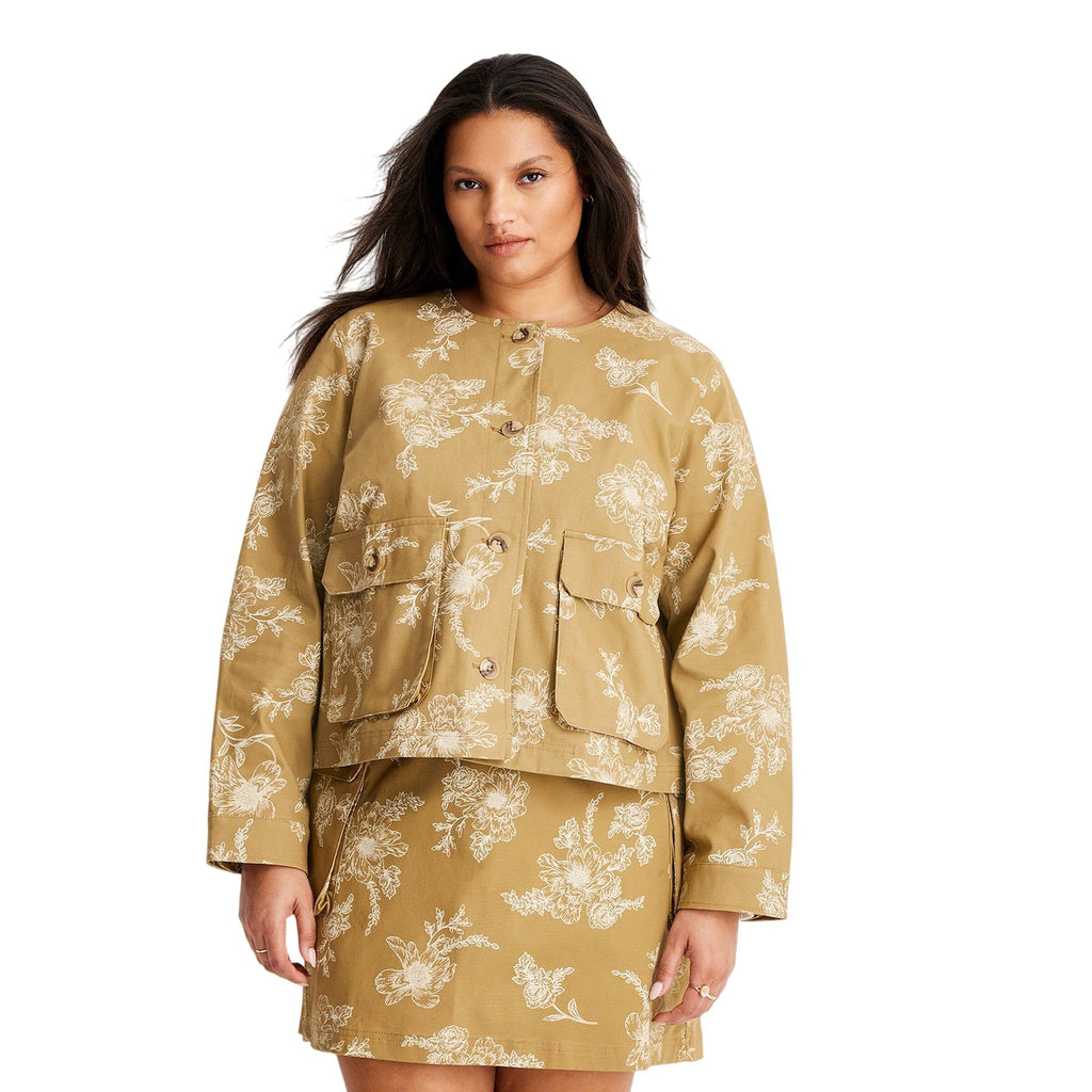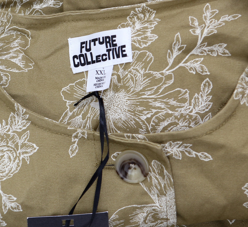 Get your wardrobe ready for cooler months with this Utility Bomber Jacket from Future Collective. Made from a fabric blend of cotton, recycled cotton and spandex, this bomber jacket features a round neckline with a front button-down style for easy wear. Tailored in an easy fit, this mid-length jacket has long sleeves with buttoned cuffs for extra flair. Plus, it boasts two front pockets for functional style. Future Collective: Inspired by what’s now to inform what’s next. Utility bomber jacket Made from a fabric blend of cotton, recycled cotton and spandex Round neckline with a front button-down style Long sleeves with buttoned cuffs Easy fit, mid length 2 front pockets Sizing: Womens Plus Material: 92% Cotton, 5% Recycled Cotton, 3% Spandex Fit: Easy Fit Fabric Name: Woven Garment Style: Front Button Down Length: Below Waist Cuff Type: Single Cuff Garment Details: Front Pocket Fabric Weight Type: Midweight Fabric Number of Pockets: 2 Care and Cleaning: Machine Wash, Tumble Dry