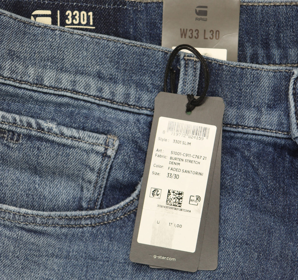 The G-Star 3301 Slim Fit Jeans feature a classic 5-pocket construction inspired by authentic Western denim, updated with a slimmer leg for a clean look Slim Fit: Tight waist, short front rise, regular back rise, narrow from thigh to hem Constructed from our Elto Black Stretch Denim, a 10.2oz denim partially made from recycled and renewable resources. Superb stretch and excellent recovery for added comfort and movement 3x1 right hand twill construction