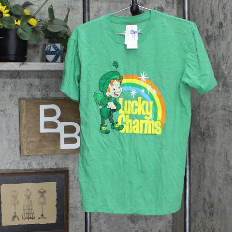 Add cute, eye-catching St. Patrick's Day flair to your look with the General Mills Lucky Charms Short-Sleeve T-Shirt. This green T-shirt showcases an adorable illustration of Lucky the Leprechaun against a vibrant rainbow arc, accented with star twinkles and the cheerful text "Lucky Charms" for a touch of cheery appeal. This green pullover tee is crafted from a soft, breathable fabric to keep you nice and comfortable whether you're attending a St. Patrick's parade or just enjoying your morning cereal. Wear it with your favorite pair of jeans and sneakers for a casual look, or add to a white skirt and heels for a dressed-up look.