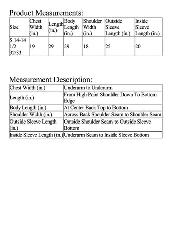 | Size | Chest Width (in.) | Length (in.) | Body Length (in.) | Shoulder Width (in.) | Outside Sleeve Length (in.) | Inside Sleeve Length (in.) |
