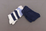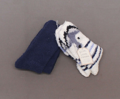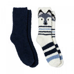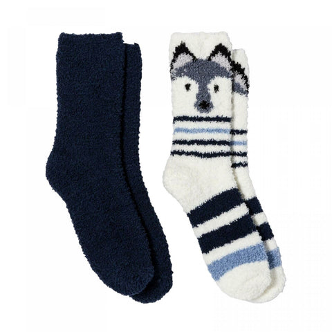 Cozy crew socks in a two pair pack with a solid navy pair and a striped wolf pair.