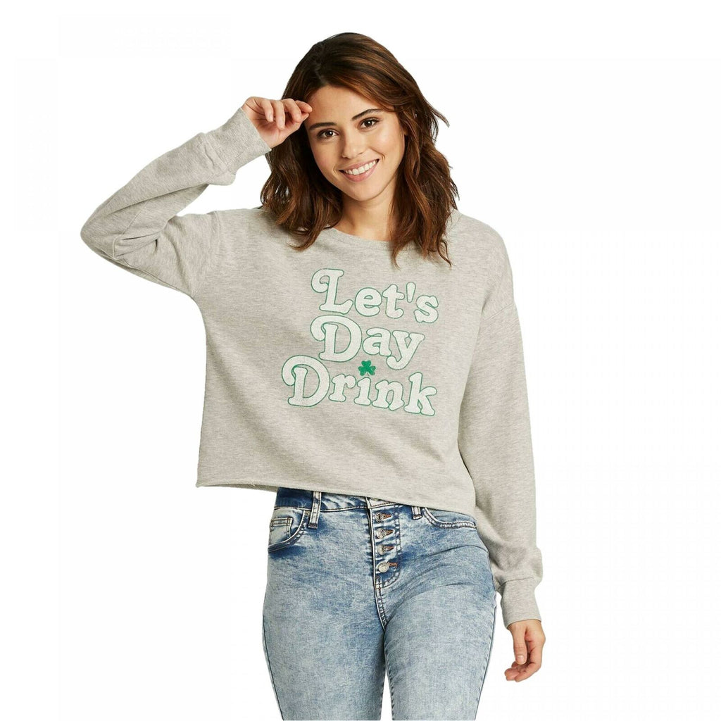 Put your playful personality on display this St. Patrick's Day with the Let's Day Drink Cropped Sweatshirt from Grayson Threads. In light gray for easy styling, this long-sleeve cropped tee features the phrase "Let's Day Drink" in large white text, and a small green clover stands in for the dot above the ""I"" for added festive flair. Lightweight fabric keeps things comfy, while the drop sleeves lend to the overall casual-cool vibe. Simply throw it on with a pair of leggings or jeans for a comfy yet party-ready look you'll love.