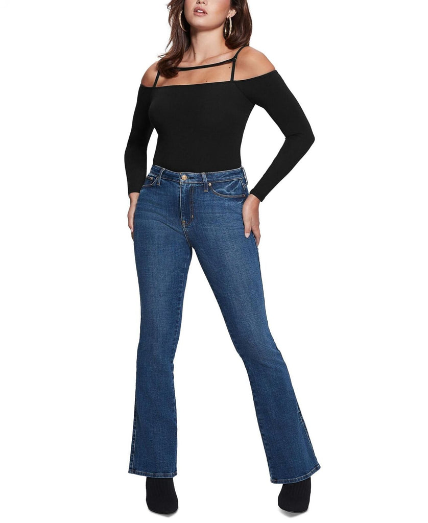 This harness-inspired bodysuit features long sleeves that look off shoulder with a sexy strap design, cheeky fit and a snap-button closure. Contains organic cotton and wood-based fibers.