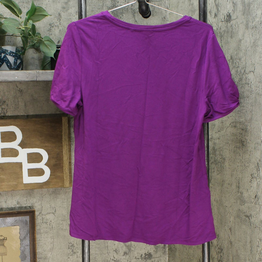 Features: scoop neckline, above-the-elbow sleeve with twist detail, signature swing, side slits