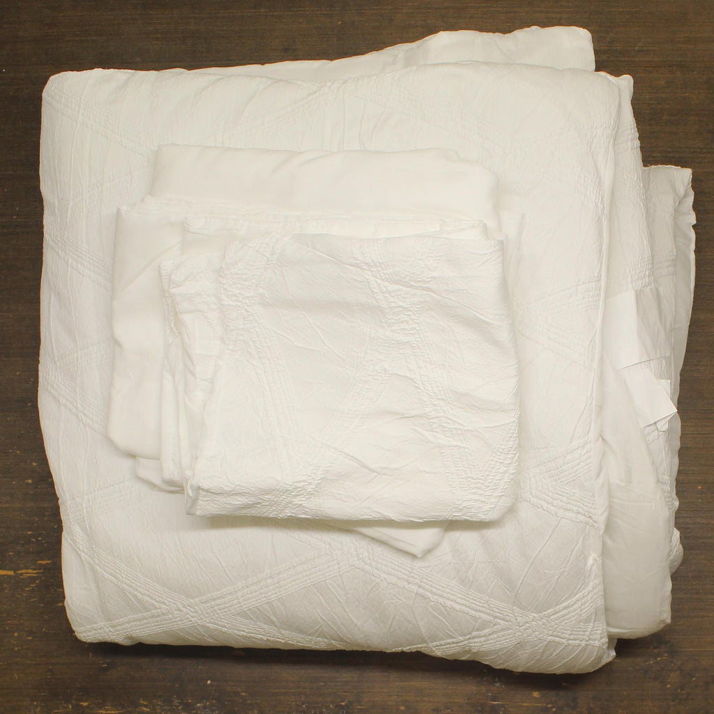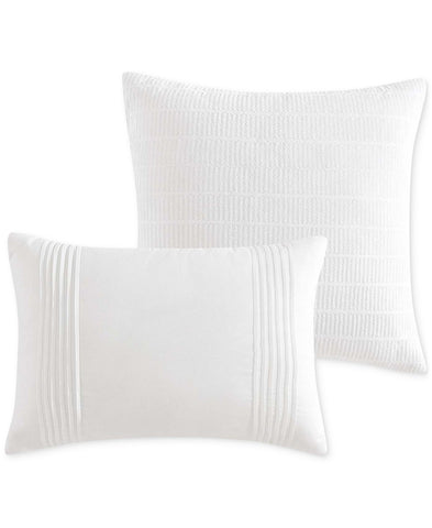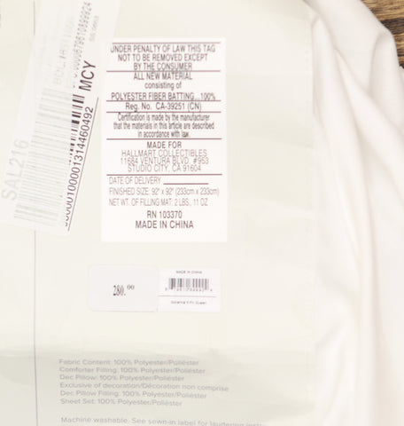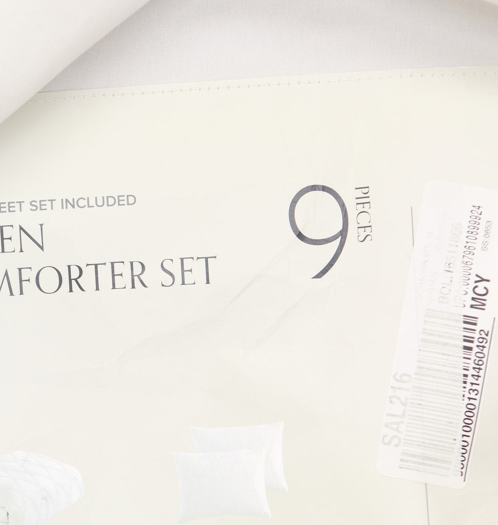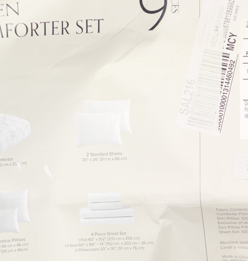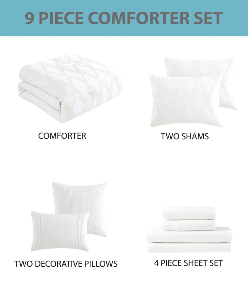Elegant in all white, the Goranna comforter from features a geometric jacquard pattern polished with woven texture. The set includes everything you need to refresh your room: shams, sheets and more. Features Set includes: comforter, two shams, four-piece sheet set, two decorative pillows Year-round warmth Allover geometric jacquard print with raised weaves Approx. dimensions: comforter: 92" x 92"; sham: 20" x 26"; flat sheet: 90" x 102"; fitted sheet: 60" x 80" x 14"D; pillowcase: 20" x 30"; decorative pillows: 18" x 18" and 12" x 18" Asian American & Pacific Islander Owned, Woman Owned Shell, fill: polyester Machine wash Imported