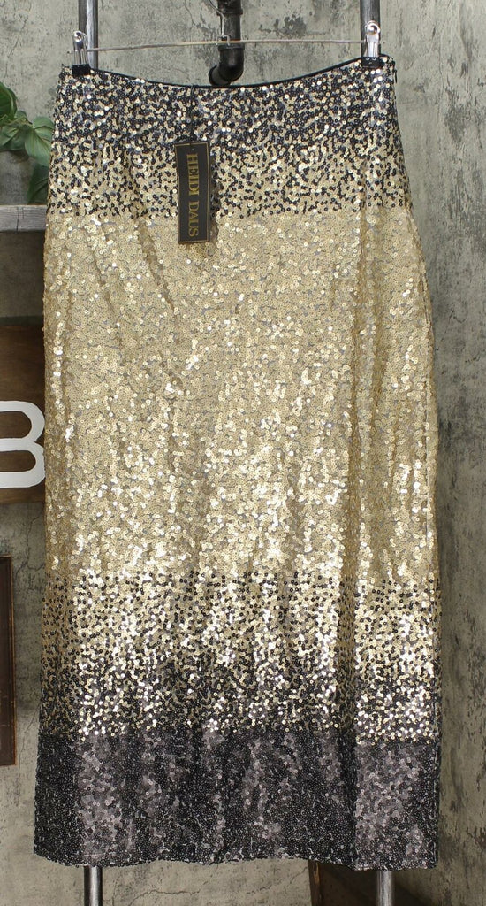 Life won't sparkle unless you do. This ombre-designed sequin maxi skirt is a memorable party choice paired with a woven blouse or satin tank and your fabulous Heidi Daus jewels.