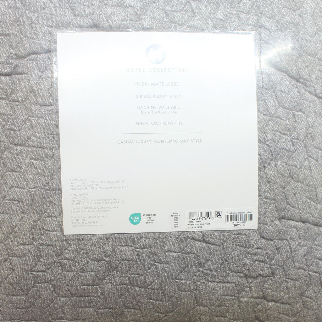 Understated and stylish, the Prism comforter set from Hotel Collection features a subtle micro-geo pattern in soft neutral tones on all-cotton matelassé. Features Set includes: comforter, two shams Medium warmth Approx. dimensions: comforter: 110" x 96"; shams: 21" x 37" Exclusive 100% cotton; fill: polyester Machine wash Imported