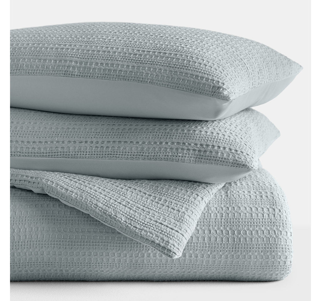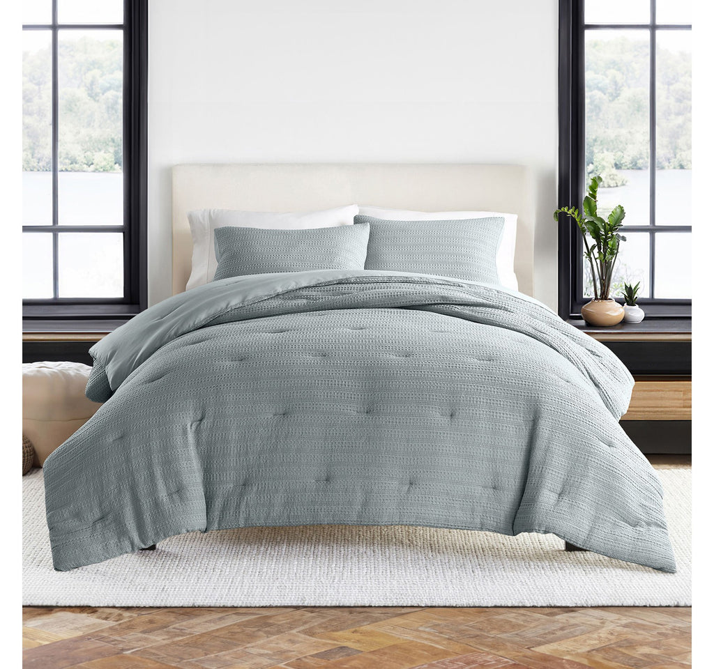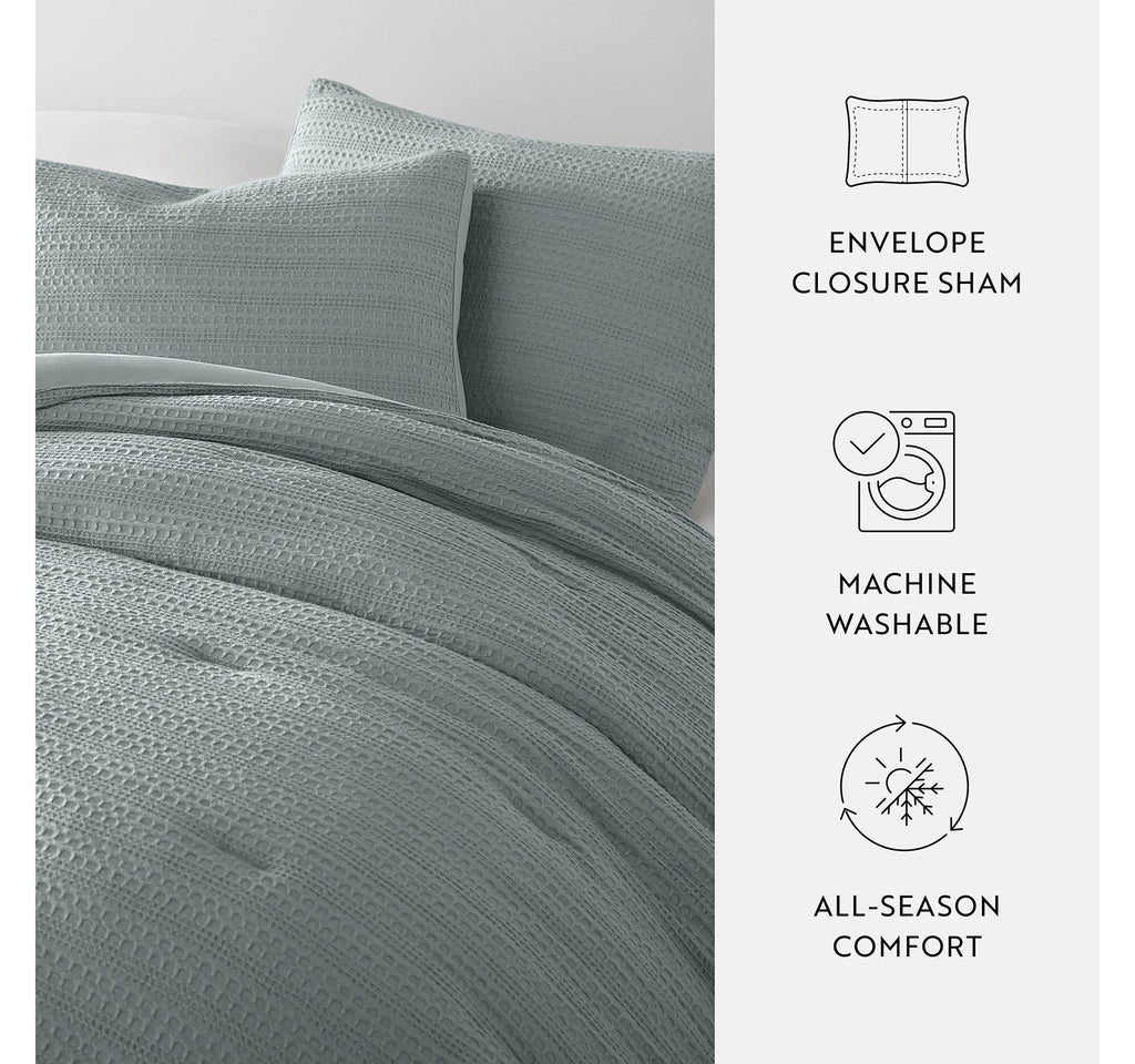 ndulge in the epitome of comfort with our exquisite 3-piece waffle textured comforter set. Its polyester fill ensures a dreamy sleep experience, while the soft pre-wash finish and double-brushed fabric provide a luxurious touch. Plus, its oversized dimensions are perfect for extra deep mattresses. Elevate your sleep sanctuary today and embrace the ultimate in cozy sophistication. # Pieces In Set: 3 Included: 2 Standard Sham(s), 1 Comforter(s) Features: Down Alternative Warmth Factor: Midweight Bed