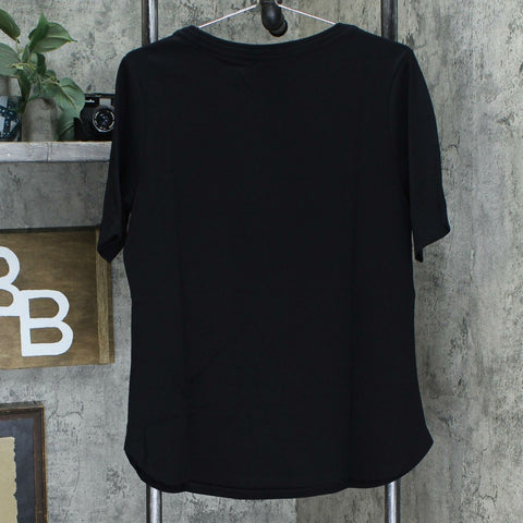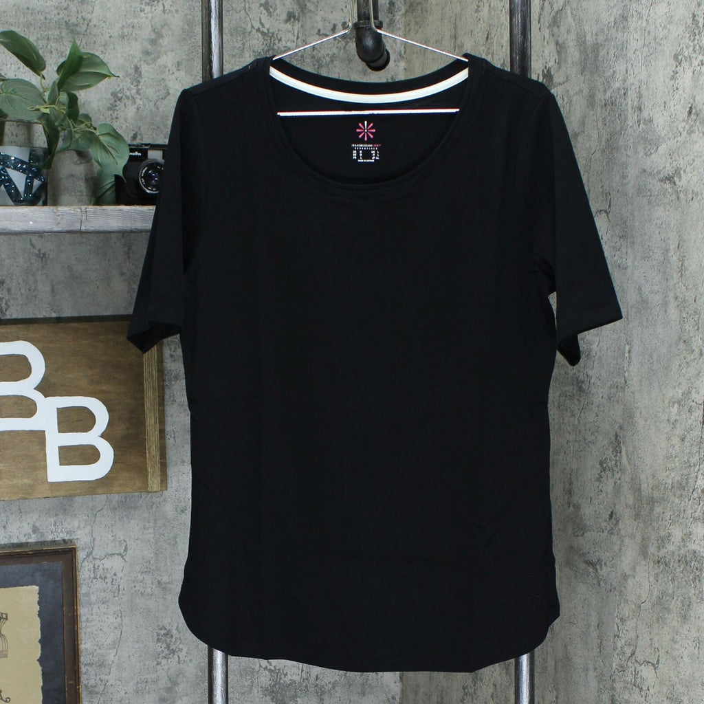 Features: scoop neckline with double inset, elbow sleeves, curved hem, daisy logo embroidery on bottom left hem
