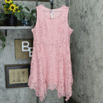 Features: fully lined, scoop neckline with lace trim, sleeveless, ladder lace trim at waist seam and front and back princess seams, handkerchief hem, midi length