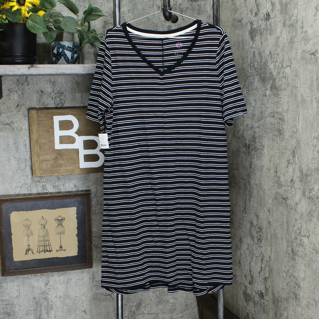 Features: V-neckline, yarn-dye stripe, set-in elbow-length sleeves, hi-low hem, knee length, front and back center seams, cotton interlock