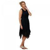 Features: fully lined, scoop neckline with lace trim, sleeveless, ladder lace trim at waist seam and front and back princess seams, handkerchief hem, midi length